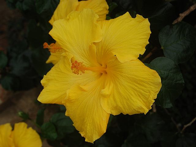 ベティ・イエロー 四季咲きの花 2013年02月16日 ハイビスカスはアオイ科フヨウ属の植物の総称である。多くの園芸品種が生まれているが、主に3系統に分類されている。ベティ・イエロー(Betty Yellow)もその1つで、ハワイアン系に属する。ハワイアン系はハワイで交配された大輪種で、鑑賞価値が高く数も多い。樹高は1メートルから2メートルである。葉は楕円形で互い違いに生える(互生)。手のひら状に裂けるものもあり、葉の縁には粗いぎざぎざ(鋸歯)がある。開花時期は周年である。花の色は鮮やかな黄色で、花の真ん中は黄褐色になる。花の真ん中から外側に向けて放射線状の脈が走る。花柱は黄色く、柱頭は赤い。属名の Hibiscus はギリシャ語由来で「Hibis(エジプトの女神)」の名からきているとの説があり、大形のゼニアオイ属につけられた名である。写真は3月に大阪市の咲くやこの花館で撮った。学名:Hibiscus 'Betty Yellow'★ベティの名どこか似合いのハイビスカス 目に飛び込むよ南国の色花図鑑植物図鑑|味の麺匠戸田久|おこめの鬼平|フロム蔵王|花の本屋さん|楽天トラベル|