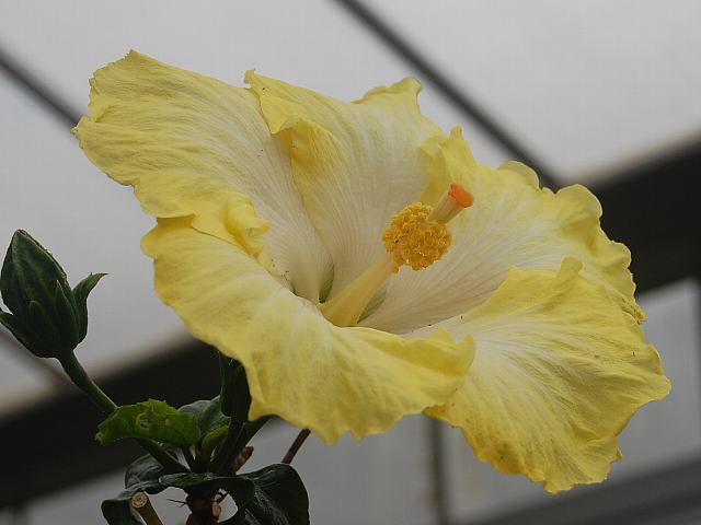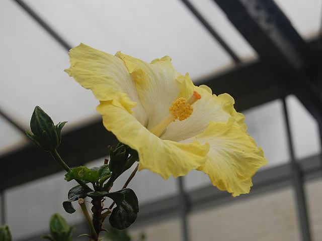 ポッターズ・イエロー 四季咲きの花 2013年02月17日 ハイビスカスはアオイ科フヨウ属の植物の総称である。多くの園芸品種が生まれているが、主に3系統に分類されている。ポッターズ・イエロー(Potters Yellow)もその1つで、ハワイアン系に属する。ハワイアン系はハワイで交配された大輪種で、鑑賞価値が高く数も多い。樹高は1メートルから2メートルである。葉は楕円形で互い違いに生える(互生)。手のひら状に裂けるものもあり、葉の縁には粗いぎざぎざ(鋸歯)がある。開花時期は周年である。花の色は黄色で、花の真ん中は白い。花弁が重なるように咲く。花柱は黄色く、柱頭はオレンジ色である。属名の Hibiscus はギリシャ語由来で「Hibis(エジプトの女神)」の名からきているとの説があり、大形のゼニアオイ属につけられた名である。写真は3月に大阪市の咲くやこの花館で撮った。学名:Hibiscus 'Potters Yellow'★空見上げ海風好きと言うように 心地よく咲く南国の花花図鑑植物図鑑|味の麺匠戸田久|おこめの鬼平|フロム蔵王|花の本屋さん|楽天トラベル|