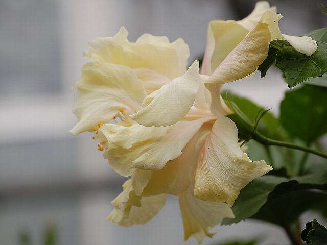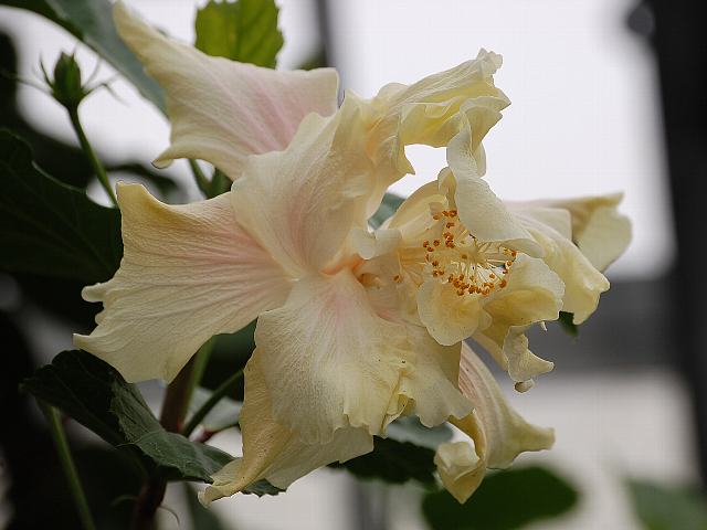 キャッスル・ホワイト 四季咲きの花 2013年02月18日 ハイビスカスはアオイ科フヨウ属の植物の総称である。多くの園芸品種が生まれているが、主に3系統に分類されている。キャッスル・ホワイト(Castle White)もその1つで、ハワイアン系に属する。ハワイアン系はハワイで交配された大輪種で、鑑賞価値が高く数も多い。樹高は1メートルから2メートルである。葉は楕円形で互い違いに生える(互生)。手のひら状に裂けるものもあり、葉の縁には粗いぎざぎざ(鋸歯)がある。開花時期は周年である。花の色はベージュがかった白で、半八重咲きである。花径15センチくらいの大輪である。花弁は不規則に捩れている。花柱は淡い黄色で、柱頭も黄色である。属名の Hibiscus はギリシャ語由来で「Hibis(エジプトの女神)」の名からきているとの説があり、大形のゼニアオイ属につけられた名である。写真は3月に大阪市の咲くやこの花館で撮った。学名:Hibiscus 'Castle White'★複雑に捩れた花弁が楽しいよ ハイビスカスと思えぬ形花図鑑植物図鑑|味の麺匠戸田久|おこめの鬼平|フロム蔵王|花の本屋さん|楽天トラベル|