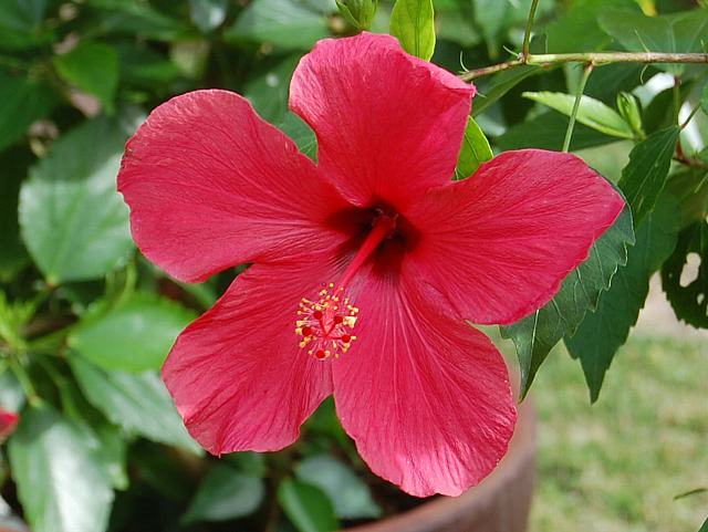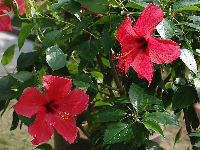 カイロレッド 四季咲きの花 2013年01月31日 ハイビスカスはアオイ科フヨウ属の植物の総称である。多くの園芸品種が生まれているが、主に3系統に分類されている。カイロレッド(Cairo Red)もその1つで、オールド系に属する。仏桑花(ブッソウゲ:Hibiscus rosa-sinensis)やヨーロピアン系と呼ばれるものなどがこの系統に属する。本種はヨーロピアン系の1つである。樹高は1メートルから2メートルである。葉は楕円形で互い違いに生える(互生)。手のひら状に裂けるものもあり、葉の縁には粗いぎざぎざ(鋸歯)がある。開花時期は周年である。花の色は緋色である。花弁のつけ根は濃い赤色になる。花柱は赤く、柱頭も赤い。属名の Hibiscus はギリシャ語由来で「Hibis(エジプトの女神)」の名からきているとの説があり、大形のゼニアオイ属につけられた名である。写真は11月に沖縄県本部町の熱帯ドリームセンターで撮った。学名:Hibiscus 'Cairo Red'★こじんまり咲いているけど目の覚める 赤が目立つねカイロレッドは花図鑑植物図鑑|味の麺匠戸田久|おこめの鬼平|フロム蔵王|花の本屋さん|楽天トラベル|