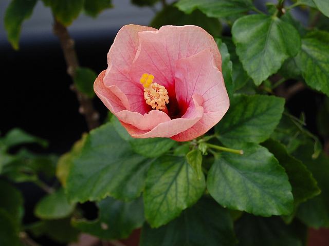 ピンク・ビブラート 四季咲きの花 2013年02月01日 ハイビスカスはアオイ科フヨウ属の植物の総称である。多くの園芸品種が生まれているが、主に3系統に分類されている。ピンク・ビブラート(Pink Vibrato)もその1つで、オールド系に属する。仏桑花(ブッソウゲ:Hibiscus rosa-sinensis)やヨーロピアン系と呼ばれるものなどがこの系統に属する。樹高は1メートルから2メートルである。葉は楕円形で互い違いに生える(互生)。手のひら状に裂けるものもあり、葉の縁には粗いぎざぎざ(鋸歯)がある。開花時期は周年である。花の色は淡いピンクである。花弁のつけ根は濃い赤色になるので、花の真ん中に目があるように見える。花弁にはひだがあり、外側に反っている。花柱は淡いピンクで、柱頭は黄色い。属名の Hibiscus はギリシャ語由来で「Hibis(エジプトの女神)」の名からきているとの説があり、大形のゼニアオイ属につけられた名である。写真は11月に沖縄県本部町の熱帯ドリームセンターで撮った。学名:Hibiscus 'Pink Vibrato'★この花も産まれはきっとヨーロッパ すかっと開いた姿が見たい花図鑑植物図鑑|味の麺匠戸田久|おこめの鬼平|フロム蔵王|花の本屋さん|楽天トラベル|