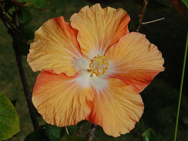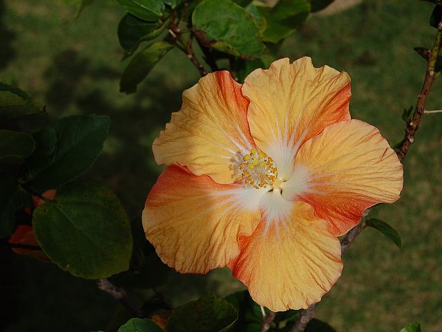 人魚姫(ニンギョヒメ) 四季咲きの花 2013年02月04日 ハイビスカスはアオイ科フヨウ属の植物の総称である。多くの園芸品種が生まれているが、主に3系統に分類されている。人魚姫(ニンギョヒメ)もその1つで、ハワイアン系に属する。ハワイアン系はハワイで交配された大輪種で、鑑賞価値が高く数も多い。樹高は1メートルから2メートルである。葉は楕円形で互い違いに生える(互生)。手のひら状に裂けるものもあり、葉の縁には粗いぎざぎざ(鋸歯)がある。開花時期は周年である。花の色は淡いオレンジ色である。花の真ん中は白く、外側に向かって放射状に白い筋が入る。花柱は白く、柱頭は黄色である。属名の Hibiscus はギリシャ語由来で「Hibis(エジプトの女神)」の名からきているとの説があり、大形のゼニアオイ属につけられた名である。写真は11月に沖縄県本部町の熱帯ドリームセンターで撮った。学名:Hibiscus 'Ninngyohime'★この花の生まれはどこか人魚姫 回る風車を思わす姿花図鑑植物図鑑|味の麺匠戸田久|おこめの鬼平|フロム蔵王|花の本屋さん|楽天トラベル|