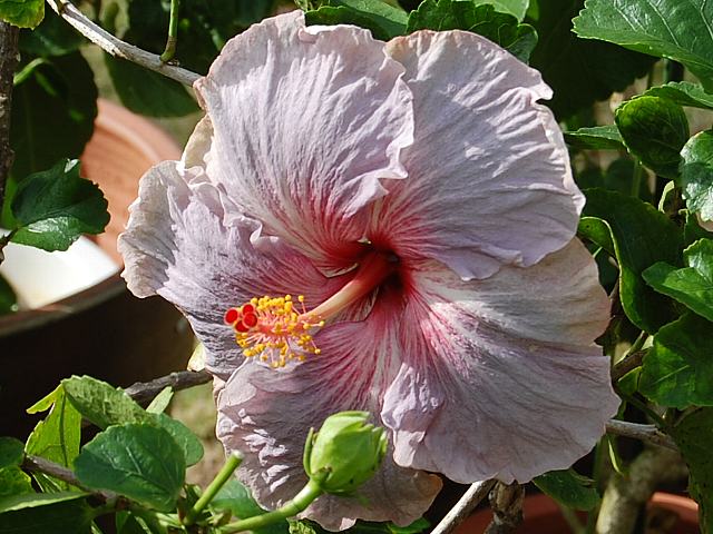 パープル・クリスタル 四季咲きの花 2013年01月26日 ハイビスカスはアオイ科フヨウ属の植物の総称である。多くの園芸品種が生まれているが、主に3系統に分類されている。パープル・クリスタル(Purple Crystal)もその1つで、ハワイアン系に属する。ハワイアン系はハワイで交配された大輪種で、鑑賞価値が高く数も多い。樹高は1メートルから2メートルである。葉は楕円形で互い違いに生える(互生)。手のひら状に裂けるものもあり、葉の縁には粗いぎざぎざ(鋸歯)がある。開花時期は周年である。花の色は淡い紫色で、真ん中は赤い。大輪で、縁はフリル状になる。花柱はピンクで、柱頭は赤い。属名の Hibiscus はギリシャ語由来で「Hibis(エジプトの女神)」の名からきているとの説があり、大形のゼニアオイ属につけられた名である。写真は12月に沖縄県本部町の熱帯ドリームセンターで撮った。学名:Hibiscus 'Purple Crystal'★寄せ合って厚味を出したみたいだね フリルきれいなパープル・クリスタル花図鑑植物図鑑|味の麺匠戸田久|おこめの鬼平|フロム蔵王|花の本屋さん|楽天トラベル|