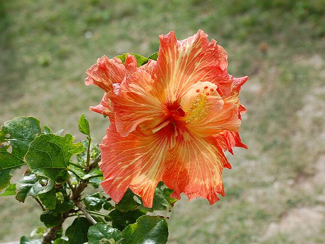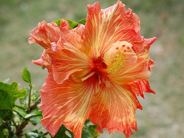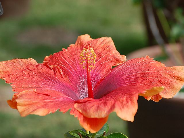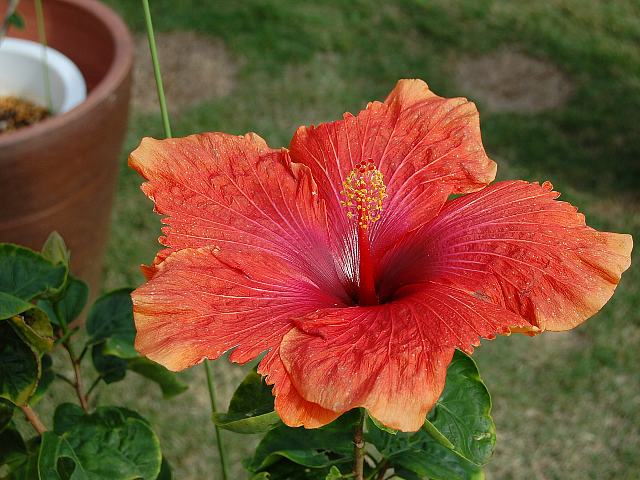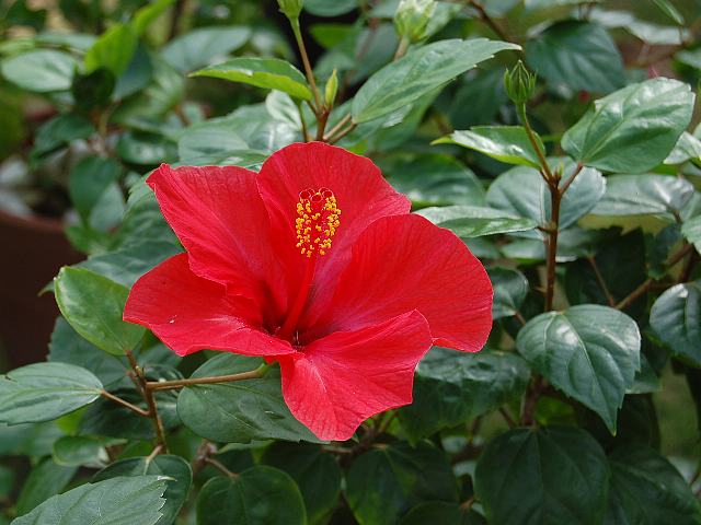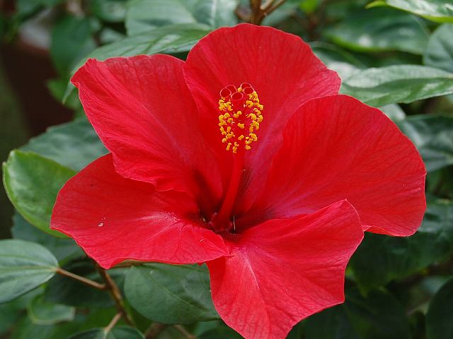 チズ・ヒューゲ 四季咲きの花 2013年01月27日 ハイビスカスはアオイ科フヨウ属の植物の総称である。多くの園芸品種が生まれているが、主に3系統に分類されている。チズ・ヒューゲ(Tiz Huge)もその1つで、ハワイアン系に属する。ハワイアン系はハワイで交配された大輪種で、鑑賞価値が高く数も多い。樹高は1メートルから2メートルである。葉は楕円形で互い違いに生える(互生)。手のひら状に裂けるものもあり、葉の縁には粗いぎざぎざ(鋸歯)がある。開花時期は周年である。花の色はオレンジがかった赤色で、縁は淡いオレンジ色である。花柱は赤く、柱頭も赤い。属名の Hibiscus はギリシャ語由来で「Hibis(エジプトの女神)」の名からきているとの説があり、大形のゼニアオイ属につけられた名である。写真は12月に沖縄県本部町の熱帯ドリームセンターで撮った。学名:Hibiscus 'Tiz Huge'★上を向き真っ赤な花が凜と咲く 南の島は冬なお暑く花図鑑植物図鑑|味の麺匠戸田久|おこめの鬼平|フロム蔵王|花の本屋さん|楽天トラベル|