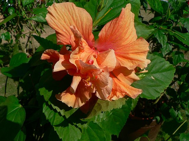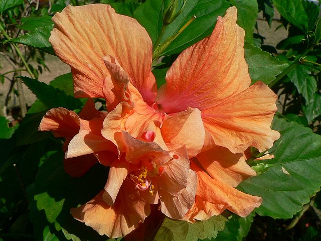 サニー 四季咲きの花 2013年01月05日 ハイビスカスはアオイ科フヨウ属の植物の総称である。多くの園芸品種が生まれているが、主に3系統に分類されている。サニー(Sunny)もその1つで、オールド系に属する。仏桑花(ブッソウゲ:Hibiscus rosa-sinensis)やヨーロピアン系と呼ばれるものなどがこの系統に属する。別名をダブル・サーモンという。樹高は1メートルから2メートルである。樹勢強くたくさんの花が咲く。葉は楕円形で互い違いに生える(互生)。手のひら状に裂けるものもあり、葉の縁には粗いぎざぎざ(鋸歯)がある。開花時期は周年である。花の色はピンクがかったオレンジ色で、八重咲きである。属名の Hibiscus はギリシャ語由来で「Hibis(エジプトの女神)」の名からきているとの説があり、大形のゼニアオイ属につけられた名である。写真は11月に沖縄県本部町の熱帯ドリームセンターで撮った。学名:Hibiscus 'Sunny'★豪快にサーモン色を振るわせて 青空似合う賑やかな花花図鑑植物図鑑|味の麺匠戸田久|おこめの鬼平|フロム蔵王|花の本屋さん|楽天トラベル|