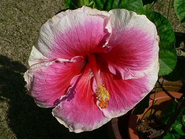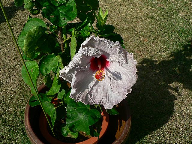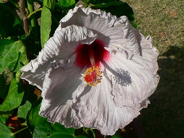バーバラ・ステイトン 四季咲きの花 2013年01月06日 ハイビスカスはアオイ科フヨウ属の植物の総称である。多くの園芸品種が生まれているが、主に3系統に分類されている。バーバラ・ステイトン(Barbara Stayton)もその1つで、ハワイアン系に属する。ハワイアン系はハワイで交配された大輪種で、鑑賞価値が高く数も多い。樹高は1メートルから2メートルである。葉は楕円形で互い違いに生える(互生)。手のひら状に裂けるものもあり、葉の縁には粗いぎざぎざ(鋸歯)がある。開花時期は周年である。花の色は基本的には白く、中心から赤、ピンク、白のグラデーションがかかる。ほぼ円形に咲き、縁はフリル状になる。花柱は赤く、柱頭は朱色である。属名の Hibiscus はギリシャ語由来で「Hibis(エジプトの女神)」の名からきているとの説があり、大形のゼニアオイ属につけられた名である。写真は11月に沖縄県本部町の熱帯ドリームセンターで撮った。学名:Hibiscus 'Barbara Stayton'★まぁるくて厚味もあるよこの花は 名前の由来聞いてみたいな花図鑑植物図鑑|味の麺匠戸田久|おこめの鬼平|フロム蔵王|花の本屋さん|楽天トラベル|