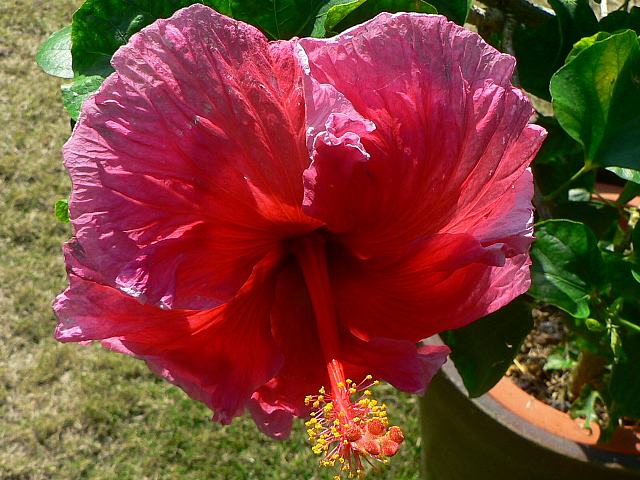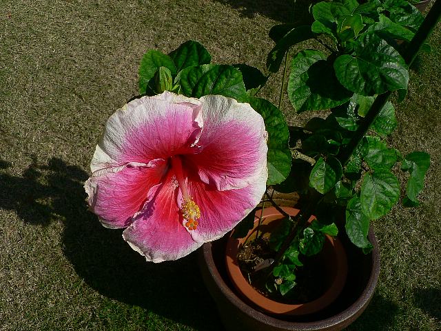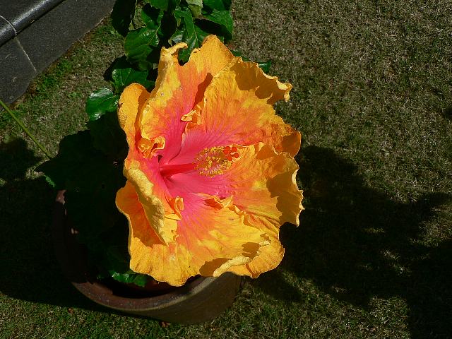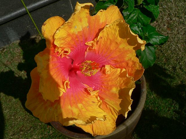 ザ・パース 四季咲きの花 2013年01月07日 ハイビスカスはアオイ科フヨウ属の植物の総称である。多くの園芸品種が生まれているが、主に3系統に分類されている。ザ・パース(The Path)もその1つで、ハワイアン系に属する。ハワイアン系はハワイで交配された大輪種で、鑑賞価値が高く数も多い。樹高は1メートルから2メートルである。葉は楕円形で互い違いに生える(互生)。手のひら状に裂けるものもあり、葉の縁には粗いぎざぎざ(鋸歯)がある。開花時期は周年である。花の色は真ん中が赤く、外側へ向かって黄色のグラデーションがかかる。花弁は大きく、縁はフリル状になり、ほぼ円形に咲く。花柱は赤く、柱頭も赤い。属名の Hibiscus はギリシャ語由来で「Hibis(エジプトの女神)」の名からきているとの説があり、大形のゼニアオイ属につけられた名である。写真は11月に沖縄県本部町の熱帯ドリームセンターで撮った。学名:Hibiscus 'The Path'★一重でも色鮮やかで息を飲む ハイビスカスのこれは極みか花図鑑植物図鑑|味の麺匠戸田久|おこめの鬼平|フロム蔵王|花の本屋さん|楽天トラベル|