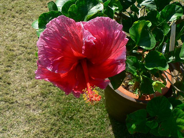クイーン・スター 四季咲きの花 2013年01月09日 ハイビスカスはアオイ科フヨウ属の植物の総称である。多くの園芸品種が生まれているが、主に3系統に分類されている。クイーン・スター(Queen Star)もその1つで、ハワイアン系に属する。ハワイアン系はハワイで交配された大輪種で、鑑賞価値が高く数も多い。別名をネイサン・チャールズ(Nathan Charles)という。これは人名由来である。樹高は1メートルから2メートルである。葉は楕円形で互い違いに生える(互生)。手のひら状に裂けるものもあり、葉の縁には粗いぎざぎざ(鋸歯)がある。開花時期は周年である。花の色は濃い赤で、大輪である。花弁の縁にフリルがあり、ほぼ円形に咲く。花柱は赤くて太く、柱頭も赤い。属名の Hibiscus はギリシャ語由来で「Hibis(エジプトの女神)」の名からきているとの説があり、大形のゼニアオイ属につけられた名である。写真は11月に沖縄県本部町の熱帯ドリームセンターで撮った。学名:Hibiscus 'Queen Star'★大輪のずっしり垂れる咲き姿 クイーン・スターの名前似合って花図鑑植物図鑑|味の麺匠戸田久|おこめの鬼平|フロム蔵王|花の本屋さん|楽天トラベル|PR