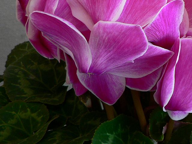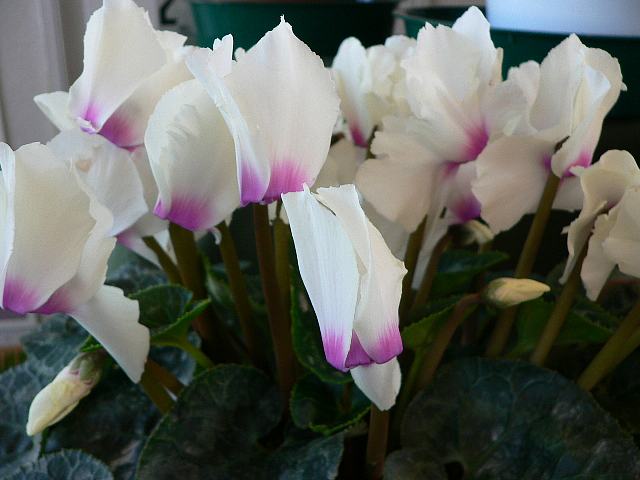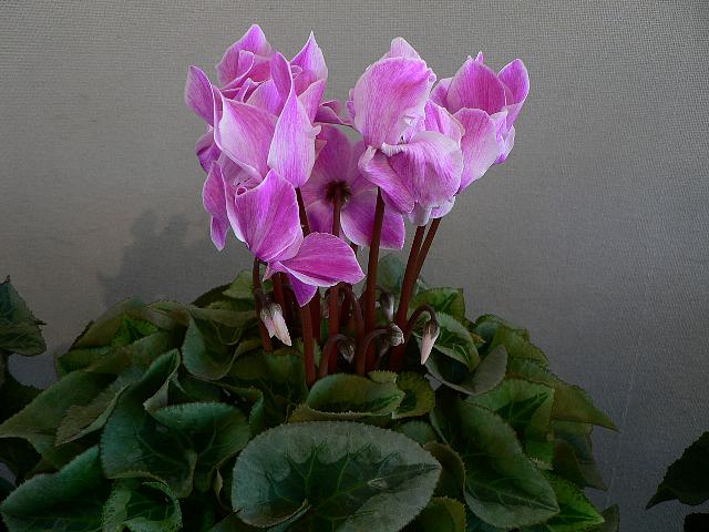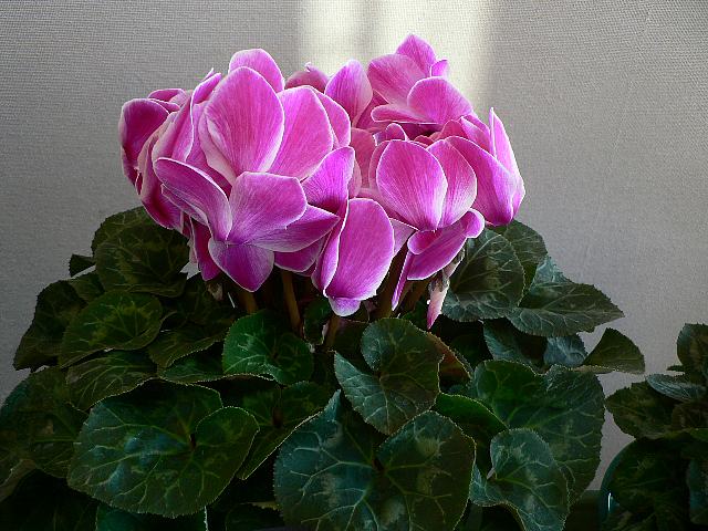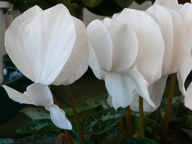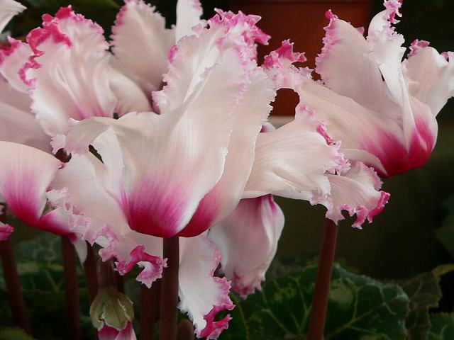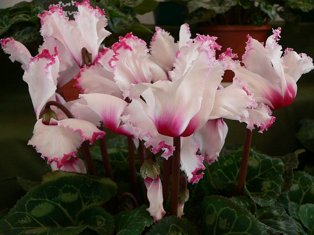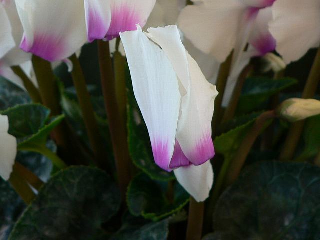 ビクトリア 冬の花 2012年12月03日 シクラメンはサクラソウ科シクラメン属の多年草である。原産地は地中海沿岸地方、西アジアである。ヨーロッパで品種改良が進められた。日本へは明治時代の末期に渡来した。現在では、鉢植え植物のトップクラスに成長している。ビクトリア(Victoria)はそうした園芸品種の1つである。花びらの縁が波打つフリンジ咲きの代表種である。つくられた時期は古く、1906年にヨーロッパで作出された。草丈は10センチから40センチくらいである。根際から生える葉には長い柄があり、心臓形である。開花時期は10月から3月くらいである。花は茎先に1輪ずつ咲く。花の色は白地に赤い縁取りが入る。属名の Cyclamen はギリシャ語の「cyklos(円)」からきている。球形に近い球根の形からつけられた名である。種小名の persicum は「ペルシャの」という意味である。写真は12月に板橋区立熱帯環境植物館で撮った。学名:Cyclamen persicum 'Victoria'★美しい花の姿が目を奪う 気品豊かにビクトリア咲く