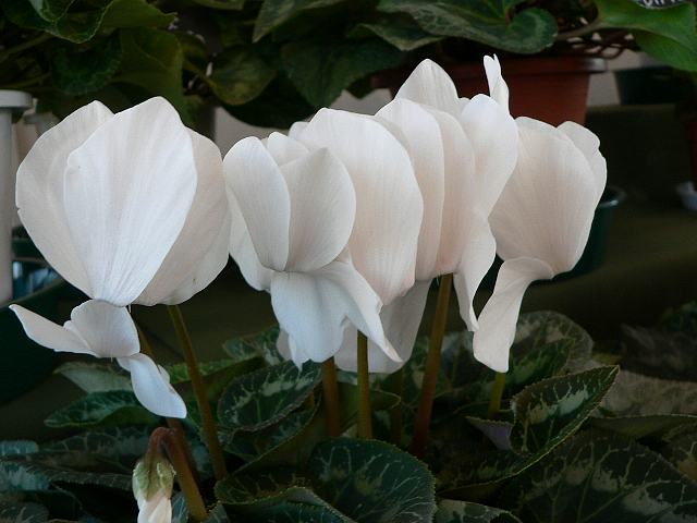 モンブラン 冬の花 2012年12月02日 シクラメンはサクラソウ科シクラメン属の多年草である。原産地は地中海沿岸地方、西アジアである。ヨーロッパで品種改良が進められた。日本へは明治時代の末期に渡来した。現在では、鉢植え植物のトップクラスに成長している。モンブラン(Mont Blanc)はそうした園芸品種の1つである。モンプランというのはフランスとイタリアの国境にあるアルプスの最高峰のことである。花の色がややクリームがかった白であることが特徴である。この色は真綿色とも表現されている。草丈は10センチから40センチくらいである。根際から生える葉には長い柄があり、心臓形である。開花時期は10月から3月くらいである。花は茎先に1輪ずつ咲く。属名の Cyclamen はギリシャ語の「cyklos(円)」からきている。球形に近い球根の形からつけられた名である。種小名の persicum は「ペルシャの」という意味である。写真は12月に板橋区立熱帯環境植物館で撮った。学名:Cyclamen persicum 'Mont Blanc'★花の色詩的に言えば真綿色 シクラメンの名人に知らしめ花図鑑植物図鑑|味の麺匠戸田久|おこめの鬼平|フロム蔵王|花の本屋さん|楽天トラベル|