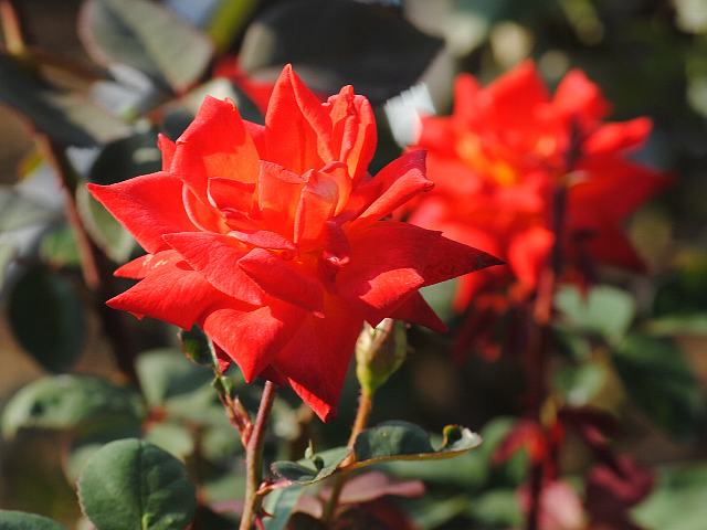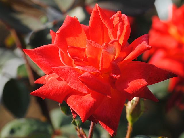 錦絵(ニシキエ) 秋の花 2012年11月25日 錦絵(ニシキエ)はバラ科バラ属の落葉低木である。フロリブンダ系(Floribunda:FL)と呼ばれるものの1つで、四季咲きの中輪である。1981年に京成バラ園芸の鈴木省三さんによって作出された。樹高は120センチくらいである。樹形は木立性である。花には微香がある。開花時期は5~11月である。花径6~8センチくらいの丸弁平咲きの半八重で、花の色はオレンジ色から朱色である。花弁数は25枚くらいである。写真は10月に神代植物公園で撮った。学名:Rosa 'Nishiki-E'★朱の色がくっきり目立つ薔薇の花 日本産まれの西洋の花花図鑑植物図鑑|味の麺匠戸田久|おこめの鬼平|フロム蔵王|花の本屋さん|楽天トラベル|