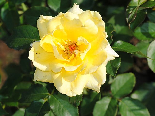 ミラベラ 秋の花 2012年11月26日 ミラベラ(Mirabella)はバラ科バラ属の落葉低木である。ミラベラというのは圧倒的な美しさを意味する女性名で、ラテン語のmirabilis(不思議な:英語のmiracleに発展)を語源とする。フロリブンダ系(Floribunda:FL)と呼ばれるものの1つで、四季咲きの中輪である。1995年にアメリカJackson & Perkins社のザリー(Keith W. Zary)によって作出された。樹高は80~100センチくらいである。樹形は横張り性である。花にはよい香りがある。開花時期は5~11月である。花径8~10センチくらいの丸弁高芯咲きの半八重で、花の色は明るい黄色である。花弁数は25~30枚くらいである。鉢植えにも向いている。写真は10月に神代植物公園で撮った。学名:Rosa 'Mirabella'★柔らかな明るい黄色がよく映えて 不思議にいざなうミラベラの花花図鑑植物図鑑|味の麺匠戸田久|おこめの鬼平|フロム蔵王|花の本屋さん|楽天トラベル|