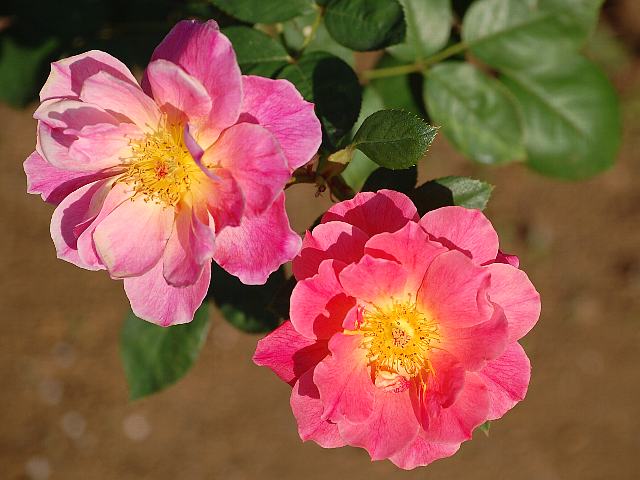 ファンファーレ 秋の花 2012年11月16日 ファンファーレ(Fanfare)はバラ科バラ属の落葉低木である。フロリブンダ系(Floribunda:FL)と呼ばれるものの1つで、四季咲きの中輪である。1956年にアメリカのハーバート・スイム(Herbert C. Swim)によって作出された。樹高は150センチくらいである。樹形は木立性である。花には微香がある。開花時期は5~11月である。花径9センチくらいのカップ咲きの半八重である。花の色は濃いピンクで、真ん中が黄色味を帯びる。写真は10月に神代植物公園で撮った。学名:Rosa 'Fanfare'★重なった色華やかに咲き誇る ファンファーレはアメリカの薔薇