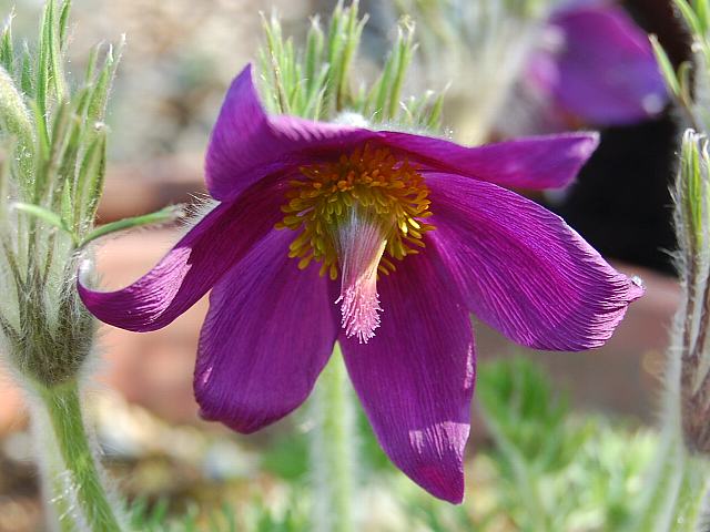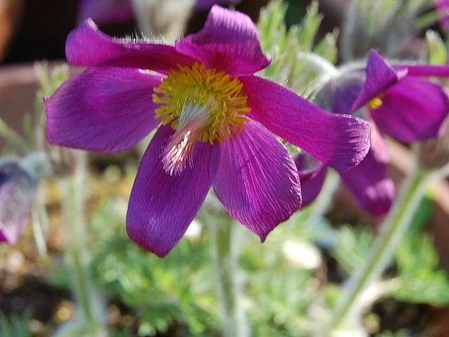 プルサティラ・アルバナ 春の花 2016年04月18日 プルサティラ・アルバナはキンポウゲ科オキナグサ属(プルサティラ属)の多年草である。プルサティラ属は北半球に45種くらいが分布する。日本にも翁草(オキナグサ)などが分布し、属名の和名をオキナグサ属という。ただし、分類の仕方によってはイチリンソウ属(Anemone)とされることもある。本種はコーカサスからトルコにかけて分布し、標高2200メートルから4200メートルの山地の斜面に生える。草丈は15センチから30センチくらいである。根際から生える葉は羽状複葉で長い柄があり、小葉は手のひら状に深く裂ける。茎につく葉には柄はなく、線形である。葉や茎には長くて白い絹のような毛が密に生える。開花時期は平地では4月から5月である。茎先に1つずつ花をつける。花の色は青紫色や紅紫色で、花径は3センチくらいである。園芸品種には黄色のものもある。花弁はなく、6枚の萼片が花弁のようにつき、釣鐘状で横向きに咲く。外側は長くて白い毛で被われている。 中にはたくさんの雄しべと雌しべが詰まっている。花の後にできる実はそう果(熟しても裂開せず、種子は1つで全体が種子のように見えるもの)で、球状に集まったたくさんの種子がつく。属名の Pulsatilla はラテン語の「pulso(鳴る)」の縮小形である。花の形を鐘にたとえて名づけられた。種小名の albana は「アルバニア(Albania)の」という意味である。写真は4月に東京都薬用植物園で撮った。学名:Pulsatilla albana(syn. Anemone albana)★土地勘があまりないけどコーカサス アルバニアとの関係いかに花図鑑植物図鑑ミラーサイト|味の麺匠戸田久|おこめの鬼平|フロム蔵王|花の本屋さん|楽天トラベル|