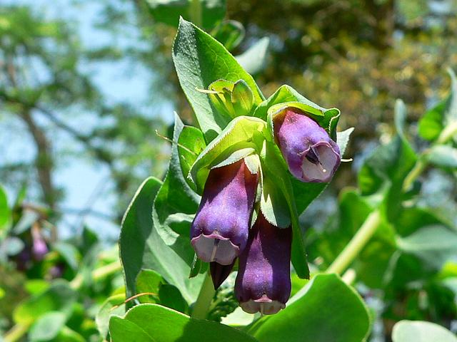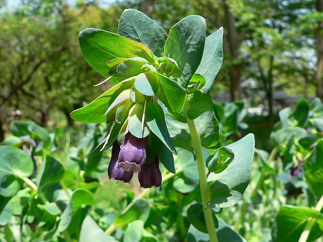プライド・オブ・ジブラルタル 春の花 2016年04月20日 黄花瑠璃草(キバナルリソウ)はムラサキ科キバナルリソウ属(ケリンテ属)の一年草である。ケリンテ属はヨーロッパや地中海沿岸地方に10種くらいが分布する。ケリンテ・マイヨル(Cerinthe major)に黄花瑠璃草(キバナルリソウ)の和名があり、属名の和名もキバナルリソウ属という。黄花瑠璃草(キバナルリソウ)の原産地は南ヨーロッパである。属名の読み方は、園芸的には英語風のセリンセで表示されることが多い。プライド・オブ・ジブラルタル(Pride of Gibraltar)はその園芸品種である。特徴は、花の色が紫色をしていることである。原種の場合は、花筒の上部は暗い紫色、下部が黄色である。草丈は30センチから60センチくらいである。葉は楕円形で、互い違いに生える(互生)。葉は茎を抱き、シルバーがかった青緑色をしている。開花時期は4月から6月くらいである。紫色をした釣鐘形の花を下垂させて咲かせる。花のように見えるのは苞(葉の変形したもの)である。苞に覆われて見えないが花の根元は黄色い。花の後にできる実は分果(複数の子房からできた果実)で、4つのブロックからなる。属名の Cerinthe はギリシャ語の「ceros(ワックス)+anthos(花)」からきている。ミツバチが巣づくりのワックスを採るため訪れるということから名づけられた。種小名の major は「巨大な」という意味である。園芸品種名の Pride of Gibraltar は「ジブラルタルの誇り」という意味である。写真は4月に京都府立植物園で撮った。学名:Cerinthe major 'Pride of Gibraltar'★紫のシャンデリアを思わせる セリンセの花庭に似合って花図鑑植物図鑑ミラーサイト|味の麺匠戸田久|おこめの鬼平|フロム蔵王|花の本屋さん|楽天トラベル|