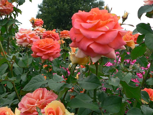ブラス・バンド 秋の花 2012年10月28日 ブラス・バンド(Brass Band)はバラ科バラ属の落葉低木である。フロリブンダ系(Floribunda:FL)と呼ばれるものの1つで、四季咲きの中輪である。1993年にアメリカのクリステンセン(J. E. Christensen)によって作出された。樹高は80~130センチくらいである。樹形は半横張り性である。花には微香がある。開花時期は5~11月である。花径8~10センチくらいの丸弁房咲きの八重で、花の色はオレンジ色、花弁の裏は黄味を帯びる。花弁数は30~40枚くらいである。写真は10月に神奈川県立フラワーセンター大船植物園で撮った。学名:Rosa 'Brass Band'★遠くから見てもすっきり杏色 賑やかに咲くブラス・バンドは