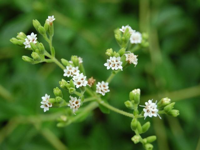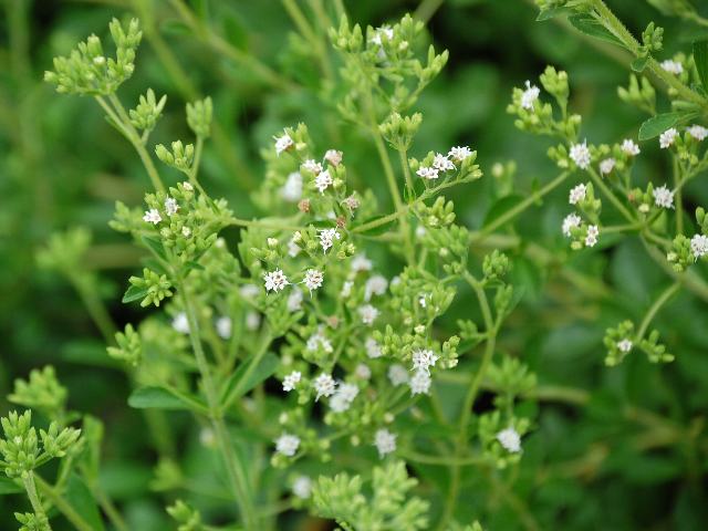 ステビア 秋の花 2012年10月03日 ステビアはキク科ステビア属の多年草である。原産地は南アメリカのパラグアイである。16世紀ころから甘味料として使用されてきたという。日本へは1971年に導入され、甘味料として栽培されている。草丈は50~100センチくらいである。葉はやや先の尖った楕円形で、向かい合って生える(対生)。開花時期は9~11月である。小さく白い花(頭花)が群がって咲く。花の後にできる実はそう果(熟しても裂開せず、種子は1つで全体が種子のように見えるもの)である。低カロリー食品で、糖尿病患者用の食品の甘味料として広く利用されている。属名の Stevia はスペインの植物学者「エステベ(P. J. Esteve)さん」の名にからきている。種小名の rebaudiana はパラグアイの薬剤師「レバウディ(Ovidio Rebaudi)さんの」という意味である。写真は9月に東京都薬用植物園で撮った。学名:Stevia rebaudiana★虫たちを群がるように寄せ集め ステビアの花賑わい咲いて花図鑑植物図鑑|味の麺匠戸田久|おこめの鬼平|フロム蔵王|花の本屋さん|楽天トラベル|