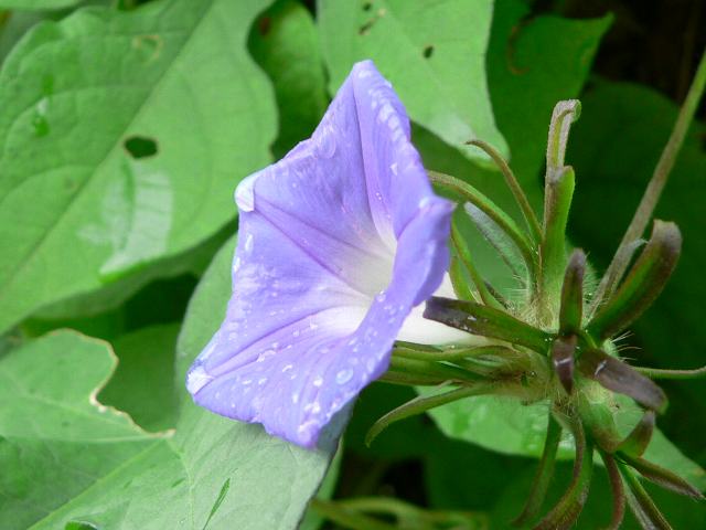 ミニスカイブルー 秋の花 2012年10月04日 ミニスカイブルー(Mini Skyblue)はヒルガオ科サツマイモ属の一年草である。アメリカ朝顔(アメリカアサガオ)の園芸品種である。基本種の原産地は熱帯アメリカである。別名を西洋朝顔(セイヨウアサガオ)ともいう。花径は3センチくらいと小さいので園芸的にはあまり利用されていないが、最近では選抜種で流通するものも出ている。本種もその1つで、発売元は Thompson & Morgan である。蔓性で茎の長さは1から2メートルになる。葉は葉の先が3つに裂け、互い違いに生える(互生)。開花時期は8~11月である。花冠は漏斗状で、花の色は空色である。花は一日花で、夜に開花し翌日の昼頃まで開いている。花の後にできる実はさく果(熟すると下部が裂け、種子が散布される果実)である。種は有毒である。属名の Ipomoea はギリシャ語の「ips(芋虫)+homoios(似た)」からきている。物に絡みついて這い登る性質からから名づけられた。種小名の hederacea は「キズタ属(Hedera)に似た」という意味である。写真は10月に京都府立植物園で撮った。学名:Ipomoea hederacea 'Mini Skyblue'★花の径小さいけれど元気よく 青を散りばめミニスカイブルー