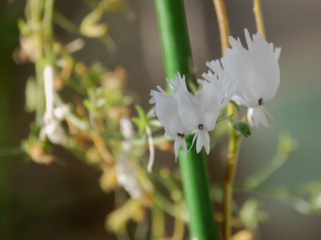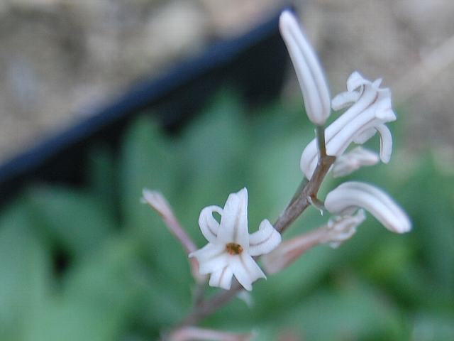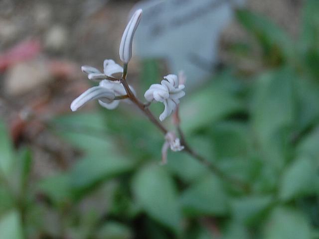 ハオルチア・リデリアナ 秋の花 2012年10月05日 ハオルチア・リデリアナはユリ科ハオルチア属の常緑多年草である。分類体系によってはアロエ科とされる。属名の読み方には「ハワーシア」、「ハオルシア」などがある。南アフリカのケープ地方に分布する多肉植物である。草丈は20センチくらいである。葉は三角形で地面にへばりつく。開花時期は秋から冬である。花茎を伸ばし、小さな筒状の花をつける。花は白地に淡い茶色の縦縞が入るが、小さくて目立たない。園芸名は寿宴殿や朝歌という。読み方ははっきりしない。属名の Haworthia は18世紀から19世紀のイギリス人の植物学者「ハース(A. H. Haworth)さん」の名からきている。種小名の ryderiana は20世紀のイギリス人の植物収集家「ライダー(E. F. Ryder)さんの」という意味である。写真は9月に京都府立植物園で撮った。学名:Haworthia ryderiana★地面から花茎伸ばしハオルチア 微風に靡き揺らり揺ら揺ら