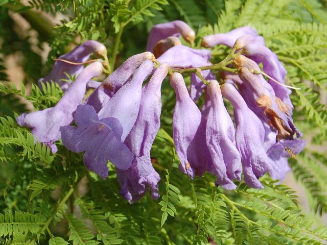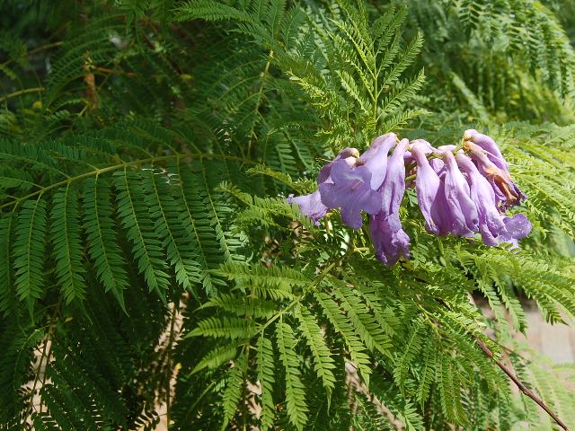 ジャカランダ・ミモシフォリア 秋の花 2012年10月07日 ジャカランダ・ミモシフォリアはノウゼンカズラ科キリモドキ属の常緑高木である。原産地は南アメリカで、ボリビア、ブラジル、アルゼンチンなどに分布する。国際自然保護連合(IUCN)のレッドリストでは絶滅危惧II類(VU)に指定されている。和名は桐擬き(キリモドキ)という。移民した人々がつけた名だという。別名を紫雲木(シウンボク)ともいう。自生地では街路樹ともされる。樹高は5~15メートルくらいである。葉は2回羽状複葉で、向かい合って生える(対生)。自生地での開花時期は5~6月である。乾期の終わりに開花する。温帯では明確なサインがないため花つきが悪いそうだ。撮影地では9~10月くらいに開花するという。枝先に総状花序(柄のある花が花茎に均等につく)を出し、青紫色をした筒状の花をつける。花の後にできる実はさく果(熟すると下部が裂け、種子が散布される果実)である。属名の Jacaranda はブラジルでの呼び名からきている。種小名の mimosifolia は「オジキソウ属(Mimosa)のような葉の」という意味である。写真は9月に大阪市の咲くやこの花館で撮った。学名:Jacaranda mimosifolia★花房がぽつんと一つ桐擬き 寒くはないか熱帯の花花図鑑植物図鑑|味の麺匠戸田久|おこめの鬼平|フロム蔵王|花の本屋さん|楽天トラベル|PR