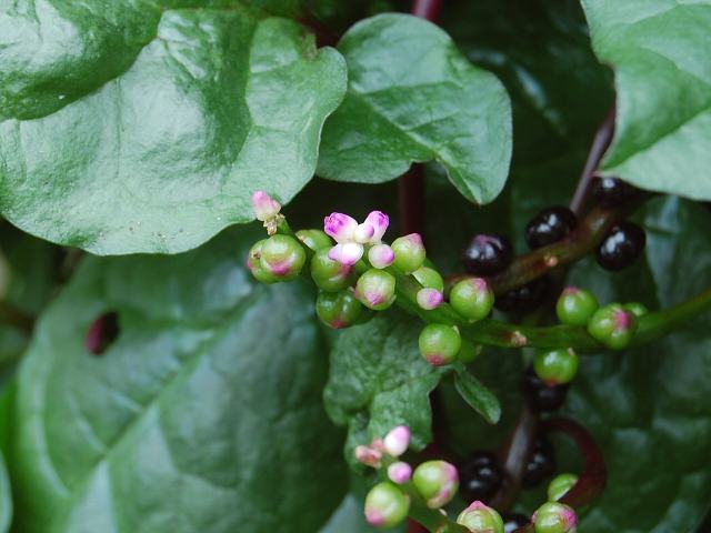 蔓紫(ツルムラサキ) 秋の花 2012年09月23日 蔓紫(ツルムラサキ)はツルムラサキ科ツルムラサキ属の蔓性多年草である。園芸上は越年草として扱われる。原産地は熱帯アジアである。中国の南部や東南アジアで栽培され、中華料理の原料として利用されている。日本でも観賞用や食用として栽培されている。草丈は100~200センチくらいである。葉は幅の広い卵形で、互い違いに生える(互生)。葉の質は分厚く、紅紫色を帯びる。葉の縁にぎざぎざ(鋸歯)はない。開花時期は7~10月くらいである。葉の脇に穂状花序(柄のない花が花茎に均等につく)を出し、淡い紅色を帯びた白い花をつける。花弁はなく、5枚の萼片もあまり開かない。雄しべは5本である。花の後にできる実は球形の液果(水分が多く柔らかい果皮をもつ果実)で、濃い紫色に熟する。日本でも「インドのほうれん草」や中国名の落葵(ラオコエイ)の呼称で新野菜として注目されている。果汁はかつて紫の染料やインクとして利用された。属名の Basella はインドのマラバー地方での現地名からきている。種小名の rubra は「赤色の」という意味である。写真は9月に大阪市大植物園で撮った。学名:Basella rubra★地味だけど何やら不思議な花つける 蔓紫に興味深々花図鑑植物図鑑|味の麺匠戸田久|おこめの鬼平|フロム蔵王|花の本屋さん|楽天トラベル|
