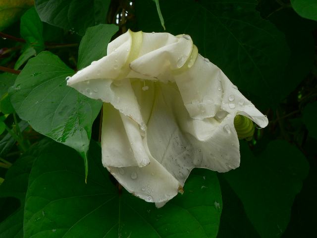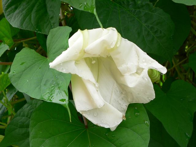 夜顔(ヨルガオ) 秋の花 2012年09月25日 夜顔(ヨルガオ)はヒルガオ科サツマイモ属の蔓性常緑多年草である。サツマイモ属(Ipomoea)に分類されることもある。原産地は熱帯アメリカである。日本へは明治時代の初期に渡来し、観賞用に栽培されている。園芸的には一年草として扱われる。茎は蔓性で長く伸び、3~6メートルくらいになる。蔓には棘があり、触ると痛い。葉は円心形で、時に3つに浅く裂ける。長い柄があり、互い違いに生える(互生)。開花時期は7~9月である。夕方に花径10センチくらいの白花を開き、朝にはしぼむ。よい香りがする。花の後にできる実はさく果(熟すると下部が裂け、種子が散布される果実)である。通称は「夕顔」だが、植物学上の夕顔(ユウガオ:Lagenaria siceraria var. hispida)はウリ科に別に存在する。こちらは瓢(フクベ)の別名があり、干瓢の原料とされる。源氏物語に登場する「夕顔」もウリ科のほうである。本種の別名は夜開草(ヤカイソウ)である。英名はムーンフラワー(Moonflower)である。花が紅紫色のものもあり、紅花夜顔(ベニバナヨルガオ)と呼ばれる。属名の Ipomoea はギリシャ語の「ips(芋虫)+homoios(似た)」からきている。物に絡みついて這い登る性質からから名づけられた。種小名の alba は「白い」という意味である。写真は10月に京都府立植物園で撮った。学名:Ipomoea alba★夜会終えほっと一息夜顔は 素顔を見せる雨に濡れつつ花図鑑植物図鑑|味の麺匠戸田久|おこめの鬼平|フロム蔵王|花の本屋さん|楽天トラベル|