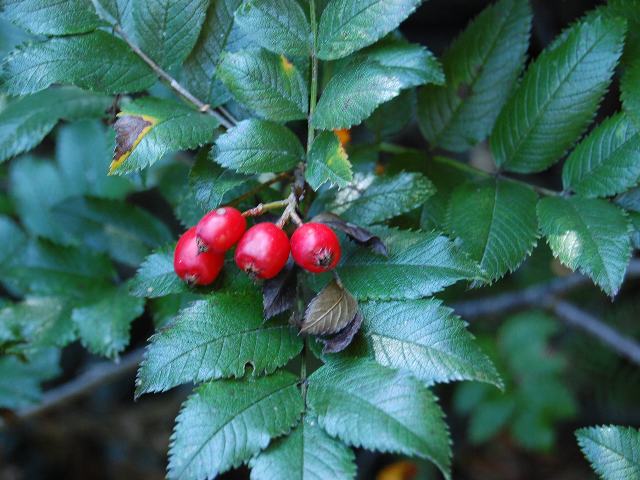 深山七竈(ミヤマナナカマド) 秋の花 2012年09月26日 深山七竈(ミヤマナナカマド)はバラ科ナナカマド属の落葉低木である。北方領土を含む北海道から本州の中部地方にかけて分布し、亜高山や高山に生える。海外では、朝鮮半島、サハリン、カムチャツカなどにも分布する。分類上は、高嶺七竈(タカネナナカマド)の変種とされている。樹高は1~2メートルである。葉は奇数羽状複葉(鳥の羽のように左右に小葉がいくつか並び、先に1つの小葉がついて1枚の葉が構成される)で、互い違いに生える(互生)。小葉の数は7~9枚くらいである。小葉の形は披針形で先が尖り、縁にはつけ根までぎざぎざ(鋸歯)がある。葉には艶がある。開花時期は6~7月である。複数の散房花序(柄のある花がたくさんつき、下部の花ほど柄が長いので花序の上部がほぼ平らになる)を出し、白い花をつける。花の後にできる実は偽果(子房以外の部分が加わってできている果実)で、秋に赤く熟する。花も実も垂れ下がらないのが特徴である。属名の Sorbus はこの属の植物の古いラテン名からきている。種小名の sambucifolia は「ニワトコ属(Sambucus)のような葉の」という意味である。変種名の pseudogracilis は「細長いような」という意味である。写真は9月に帯広市の真鍋庭園で撮った。学名:Sorbus sambucifolia var. pseudogracilis★背は低く葉っぱの艶が個性的 深山に合わせ姿を変えて花図鑑植物図鑑|味の麺匠戸田久|おこめの鬼平|フロム蔵王|花の本屋さん|楽天トラベル|