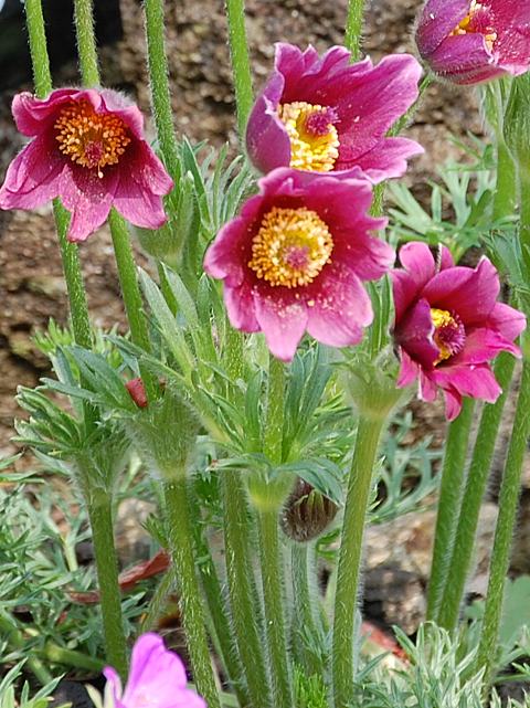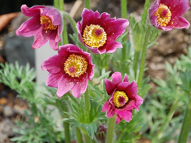 赤花西洋翁草(アカバナセイヨウオキナグサ) 春の花 2016年04月13日 西洋翁草(セイヨウオキナグサ)はキンポウゲ科オキナグサ属(プルサティラ属)の多年草である。プルサティラ属は北半球に45種くらいが分布する。日本にも翁草(オキナグサ)などが分布するので、属名の和名をオキナグサ属という。西洋翁草(セイヨウオキナグサ)はヨーロッパのイギリスからウクライナにかけて分布し、石灰岩の草地に生える。また、多くの園芸品種が作出されている。赤花西洋翁草(アカバナセイヨウオキナグサ)はそうした園芸品種の1つである。特徴は花の色が赤いことである。草丈は15センチから30センチくらいである。根際から生える葉は羽状複葉で長い柄があり、小葉は手のひら状に深く裂ける。茎につく葉には柄はなく、線形である。葉や茎には長くて白い毛が密に生える。開花時期は4月から5月である。茎先に1つずつ花をつける。花の色は赤い。花弁はなく、6枚の萼片が花弁のようにつく。中にはたくさんの雄しべと雌しべが詰まっている。葯(雄しべの花粉を入れる袋)の色は黄色である。花の後にできる実はそう果(熟しても裂開せず、種子は1つで全体が種子のように見えるもの)で、球状に集まったたくさんの種子がつく。種子の先の1つ1つに長い花柱が伸びる。花柱には灰白色の羽毛が密に生える。「翁草」の由来は、このような実の様子を老人の白髪に見立てたものである。属名の Pulsatilla はラテン語の「pulso(鳴る)」の縮小形である。花の形を鐘にたとえて名づけられた。種小名の vulgaris は「普通の」という意味である。園芸品種名の Rubra は「赤色の」という意味である。写真は4月に神奈川県立フラワーセンター大船植物園で撮った。学名:Pulsatilla vulgaris 'Rubra'★くっきりと咲いた姿は美しく 園芸品種の面目躍如花図鑑植物図鑑ミラーサイト|味の麺匠戸田久|おこめの鬼平|フロム蔵王|花の本屋さん|楽天トラベル|