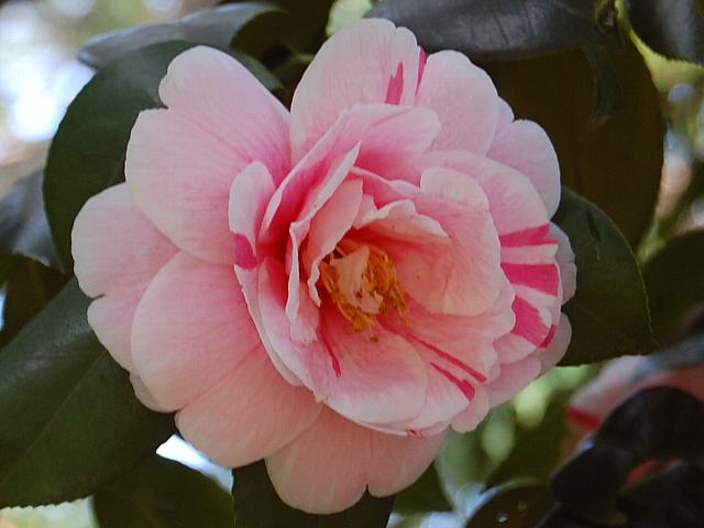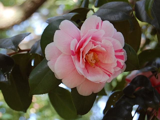 光源氏(ヒカルゲンジ) 春の花 2016年04月12日 藪椿(ヤブツバキ)はツバキ科ツバキ属の常緑低木から高木である。本州の青森県から沖縄にかけて分布する。一般的に椿(ツバキ)と呼ばれ、園芸品種の基本種となっている。光源氏(ヒカルゲンジ)もそうした園芸品種の1つである。(椿図鑑参照)江戸時代からある古い品種である。1859年に糀屋亀五郎が編んだ「椿伊呂波名寄色附(つばきいろはなよせいろつけ)」に256種のうちの1つとして掲載されている。樹高は2メートルから4メートルである。葉は楕円形で、向かい合って生える(対生)。開花時期は2月から4月くらいである。花径12センチ以上の桃色地に紅色の縦絞りが入る八重牡丹咲きの大輪である。花弁の縁は白覆輪(白い縁取りが入る)となる。牡丹咲きというのは八重咲きの花芯部で雄しべが数個に分割し、兎耳(とじ)弁と旗弁とが入り混じるもののことである。雄しべは散りしべ(雄しべが花弁の間に散らばる)である。属名の Camellia はモラビアの出身でイエズス会の宣教師だった「カメル(Georg Joseph Kamel, 1661-1706)さん」の名からきている。マニラに住み、東アジアの植物を採集した。種小名の japonica は「日本の」という意味である。写真は3月に小石川植物園で撮った。学名:Camellia japonica 'Hikarugenji'★名に負けず豪華な花の競演か 光源氏はこの上もなく花図鑑植物図鑑ミラーサイト|味の麺匠戸田久|おこめの鬼平|フロム蔵王|花の本屋さん|楽天トラベル|