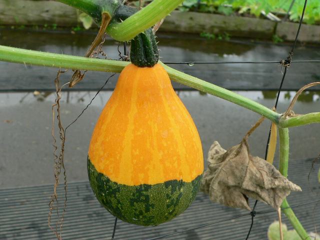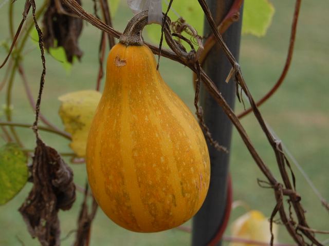 玩具南瓜(オモチャカボチャ) 果実・野菜 2012年09月16日 玩具南瓜(オモチャカボチャ)はウリ科カボチャ属の蔓性一年草である。原産地は北アメリカである。分類上は、ペポ南瓜(ペポカボチャ)の変種とされている。標準和名は飾り南瓜(カザリカボチャ)というが、玩具南瓜(オモチャカボチャ)のほうが一般的な名称になっている。直径3~10センチくらいと小型で、観賞用とされる。園芸品種がいろいろあり、色、模様、形など様々である。蔓性で、他の物に絡みついて伸びる。葉は心臓形で浅く5つに裂け、長い柄がある。開花時期は6~8月くらいである。雌雄同株で雄花と雌花がある。いずれも黄色い花である。雄花のほうが柄が長く、雌花は柄が短い。結実時期は8~9月くらいである。属名の Cucurbita はラテン語の「cucumis(ウリ)+orbis(円形)」からきている。ヒョウタンの古代ラテン名を転用したものである。種小名の pepo は「ウリの実」という意味である。変種名の ovifera は「卵のような実の」という意味である。写真は9月に神奈川県立フラワーセンター大船植物園で撮った。学名:Cucurbita pepo var. ovifera★姿見て思わず笑みがこぼれ出す いろんな形並べば楽し花図鑑植物図鑑|味の麺匠戸田久|おこめの鬼平|フロム蔵王|花の本屋さん|楽天トラベル|