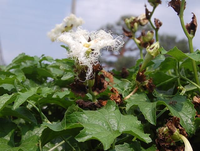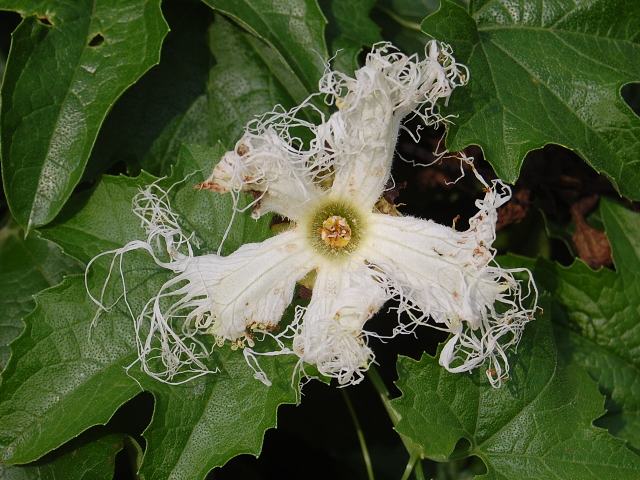 大烏瓜(オオカラスウリ) 秋の花 2012年09月17日 大烏瓜(オオカラスウリ)はウリ科カラスウリ属の蔓性多年草である。漢字では「大唐朱瓜」とも書く。紀伊半島、兵庫県、四国、九州、沖縄に分布し、林の縁や荒れ地などに生える。和歌山県、徳島県、高知県では絶滅危惧I類、兵庫県、長崎県ではII類に指定されている。海外では、台湾、中国、ベトナム、マレーシア、インドなどにも分布する。草丈は5~8メートルに達する大形の蔓性植物である。葉は心形ないし腎心形で、手のひら状に浅く5つから7つに裂け、互い違いに生える(互生)。葉の表面には短い剛毛が生える。雌雄別株である。開花時期は8~9月である。花の色は白い。花は夕方から開きはじめ、翌日の昼前には閉じる。夜咲く花は、夜行性の昆虫によって受粉する。花弁の先の糸状のものは、昆虫を呼び寄せるためだという。花の後にできる実は、直径6~7センチの円形に近い楕円形の液果(水分が多く柔らかい果皮をもつ果実)で、縞模様のある緑色から朱赤色に熟する。根は生薬でカロコンといい、利尿、解熱などの薬効がある。属名の Trichosanthes はギリシャ語の「trichos(毛)+anthos(花)」からきている。花冠の先が細かく裂けて糸状になることから名づけられた。種小名の bracteata は「苞葉のある」という意味である。写真は9月に東京都薬用植物園で撮った。学名:Trichosanthes bracteata★夜にしか開かぬ花に出合えたよ 細かく縮れてレースのようだ☆闇の中白いレースの花広げ 夜の虫たち働きまわり花図鑑植物図鑑|味の麺匠戸田久|おこめの鬼平|フロム蔵王|花の本屋さん|楽天トラベル|PR