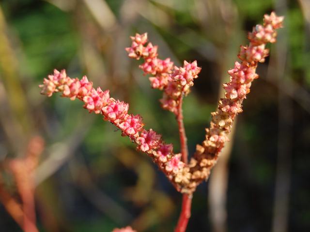 鮹の足(タコノアシ) 秋の花 2012年09月03日 鮹の足(タコノアシ)はユキノシタ科タコノアシ属の多年草である。かつてはベンケイソウ科に分類されていた。分類体系によってはタコノアシ科とされる。本州から九州にかけて分布し、沼や河原などの湿地に生える。海外では、朝鮮半島や中国にも分布する。生育地の減少によって数が減りつつある。環境省のレッドリスト(2007)では、「現時点では絶滅危険度は小さいが、生息条件の変化によっては『絶滅危惧』に移行する可能性のある種」である準絶滅危惧(NT)に登録されている。草丈は30~100センチくらいである。茎は直立し、無毛で紅色を帯びる。葉は細長い披針形で、互い違いに生える(互生)。開花時期は8~9月である。茎先から外側に反った穂状花序(柄のない花が花茎に均等につく)を数本出し、内側に黄白色の小さな花をたくさんつける。この様子を吸盤のある「鮹の足」に見立てたのが名の由来である。花の後にできる実はさく果(熟すると下部が裂け、種子が散布される果実)である。実が熟すころには全草が紅色に染まり、「ゆで蛸」のようになる。別名を沢紫苑(サワシオン)ともいう。属名の Penthorum はギリシャ語の「pente(5)++horos(特徴)」からきている。花が五数性であることから名づけられた。種小名の chinense は「中国の」という意味である。花の写真は8月につくば植物園で撮った。実の写真は11月につくば植物園で撮った。学名:Penthorum chinense★どことなくユーモラスだね鮹の足 秋の陽受けて真っ赤に染まり花図鑑植物図鑑|味の麺匠戸田久|おこめの鬼平|フロム蔵王|花の本屋さん|楽天トラベル|