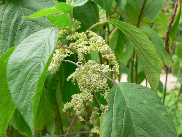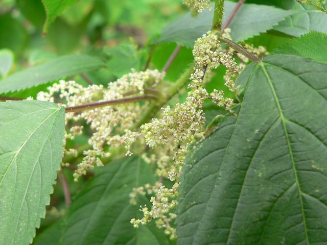 珠芽刺草(ムカゴイラクサ) 秋の花 2012年09月04日 珠芽刺草(ムカゴイラクサ)はイラクサ科ムカゴイラクサ属の多年草である。漢字では「零余子刺草」とも書く。北海道から九州にかけて分布し、山地の林の中や林の縁に生える。海外では、朝鮮半島、中国にも分布する。草丈は30~70センチくらいである。茎は緑色で刺がある。葉は幅広い楕円形で、葉は互い違いに生える(互生)。葉が向かい合って生える(対生)のがイラクサ属との区別点である。葉の縁には刺がある。葉柄のつけ根に珠芽(むかご)をつける。これが名の由来でもある。開花時期は8~9月である。雌雄同株である。雄花は葉の脇から出て、緑白色を帯びる。雌花は茎先から穂を出し、白い刺状の花柱(雌しべ)が目立つ。花の後にできる実はそう果(熟しても裂開せず、種子は1つで全体が種子のように見えるもの)である。属名の Laportea は19世紀のフランスの昆虫学者「ラポルト(F. L. de Laporte)さん」の名からきている。種小名の bulbifera は「鱗茎のある」という意味である。写真は9月に北大植物園で撮った。学名:Laportea bulbifera★葉の脇に瘤がたくさんついている 珠芽刺草棘に覆われ花図鑑植物図鑑|味の麺匠戸田久|おこめの鬼平|フロム蔵王|花の本屋さん|楽天トラベル|