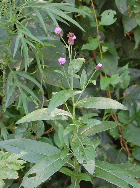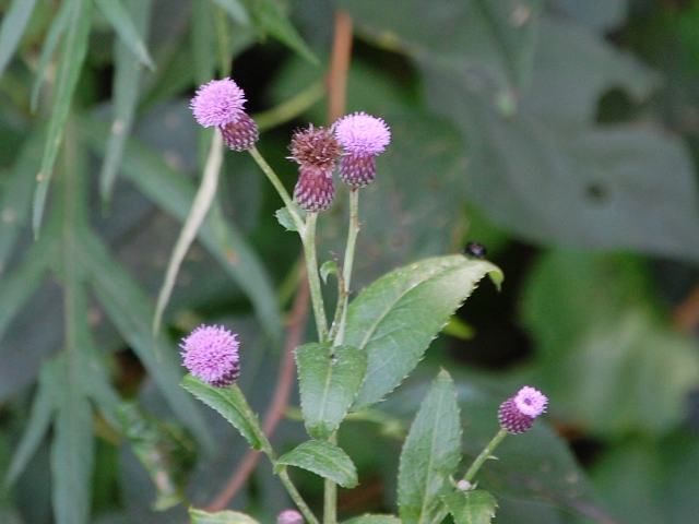 蝦夷の狐薊(エゾノキツネアザミ) 秋の花 2012年09月05日 蝦夷の狐薊(エゾノキツネアザミ)はキク科アザミ属の多年草である。北海道から本州の東北地方にかけて分布し、道端や草地、畑地などに生える。海外では、朝鮮半島、中国、シベリア、コーカサス地方、ヨーロッパロシアなどにも分布する。草丈は60~180センチくらいである。葉は細長い楕円形で、互い違いに生える(互生)。葉には柄はない。葉の先は尖り、縁には不規則なぎざぎざ(鋸歯)と棘がある。葉は羽状に切れ込まず、両面に毛が生える。雌雄異株である。開花時期は8~10月くらいである。茎の上部でよく枝分かれをし、枝先に花径1~2センチの紅紫色の花(頭花)を上向きにつける。頭花は筒状花のみからなる。総苞(花序全体を包む葉の変形したもの)は鐘形である。総苞片は反り返らない。花の後にできる実はそう果(熟しても裂開せず、種子は1つで全体が種子のように見えるもの)である。属名の Cirsium はギリシャ語の「cirsos(静脈腫)」からきている。静脈腫に薬効のある植物につけられた名が転用された。種小名の setosum は「棘状の」という意味である。写真は9月に帯広市の緑ヶ丘公園で撮った。学名:Cirsium setosum(=Breea setosa)★似た花を見た記憶から類推し そうかこれだと膝打つ思い花図鑑植物図鑑|味の麺匠戸田久|おこめの鬼平|フロム蔵王|花の本屋さん|楽天トラベル|