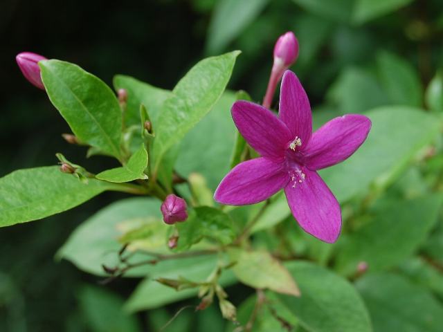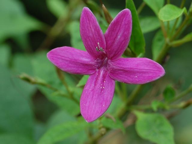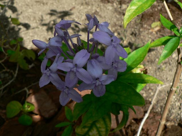 プセウデランテムム・ラクシフロルム 秋の花 2012年09月06日 プセウデランテムム・ラクシフロルムはキツネノマゴ科ルリハナガサモドキ属(プセウデランテムム属)の常緑小低木である。属名の読み方は「プセウデランセムム」や「プセウデランセマム」とするものもある。原産地はフィジー諸島である。英名はアメジストスター(amethyst star)である。樹高は60~120センチくらいである。葉は披針形(笹の葉のような形)で、向かい合って生える(対生)。開花時期は8~10月くらいである。葉の脇に花径3センチくらいの濃い赤紫色をした花をつける。花冠は筒状で、先が星形に5つに裂けて開く。花の後にできる実はさく果(熟すると下部が裂け、種子が散布される果実)である。属名の Pseuderanthemum はギリシャ語の「pseudo(偽)+Eranthemum(ルリハナガサ属)」からきている。ルリハナガサ属に似たという意味合いである。種小名の laxiflorum は「疎らな花の」という意味である。写真は9月に神奈川県立フラワーセンター大船植物園で撮った。学名:Pseuderanthemum laxiflorum★パープルの可愛い花がぽつぽつと 咲けば気分は南海の島花図鑑植物図鑑|味の麺匠戸田久|おこめの鬼平|フロム蔵王|花の本屋さん|楽天トラベル|