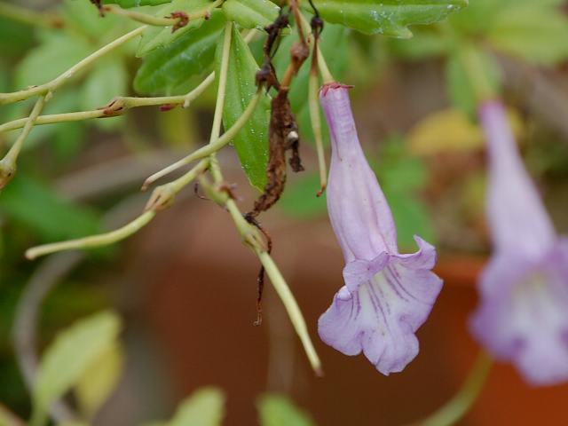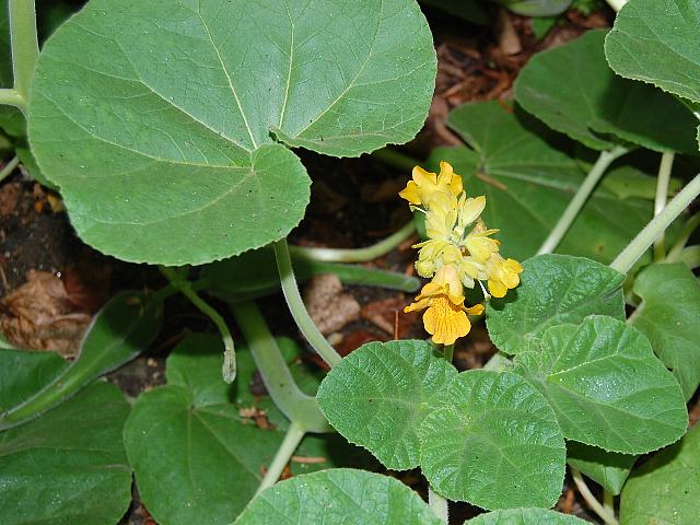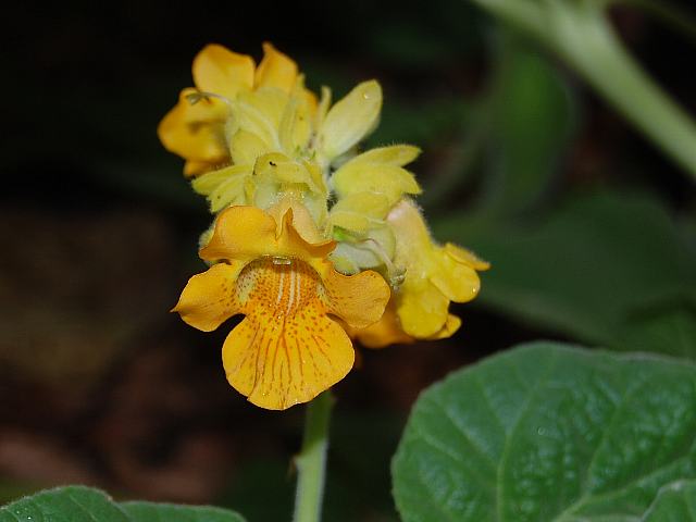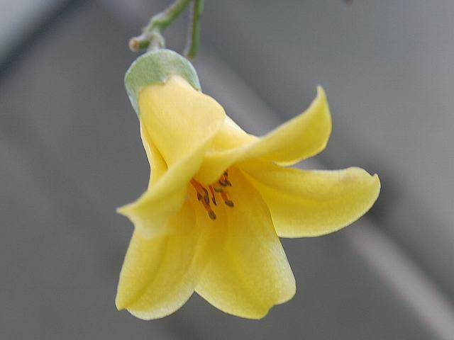 イビケラ・ルテア 夏の花 2012年08月14日 イビケラ・ルテアはツノゴマ科イビケラ属の一年草である。1属1種である。属名の読み方は「イビセラ」とするものもある。原産地はブラジル、アルゼンチンである。植物体全体に細かい腺毛(粘着物質を出す毛)があり、粘液を出して小さな昆虫を捕らえる。1989年に食虫植物として認められた。アメリカのカルフォルニア州、オーストラリア、南アフリカなどに帰化している。和名は黄花の角胡麻(キバナノツノゴマ)という。草丈は50センチくらいである。根際から生える葉は円心形で、フキの葉に似る。開花時期は7~9月くらいである。葉の脇から総状花序(柄のある花が花茎に均等につく)を出し、黄色い釣鐘形をした花をたくさんつける。花冠の先が5つに裂ける。花冠の内側には黄褐色の斑点がたくさんある。花径は5センチくらいである。実は熟すと緑色の外果皮がむけて、先が2本のかぎ爪のような形をした姿が現れる。実は長さが15センチくらいあり、大きい。属名の Ibicella はラテン語の「ibex(アイベックス:ヤギ)+cella(群れ)」からきている。ヤギの角のような果実の形状をたとえたものである。種小名の lutea は「黄色の」という意味である。写真は9月に京都府立植物園で撮った。学名:Ibicella lutea★花見れば特に怖くはないけれど 果実の形どこか不気味で花図鑑植物図鑑|味の麺匠戸田久|おこめの鬼平|フロム蔵王|花の本屋さん|楽天トラベル|