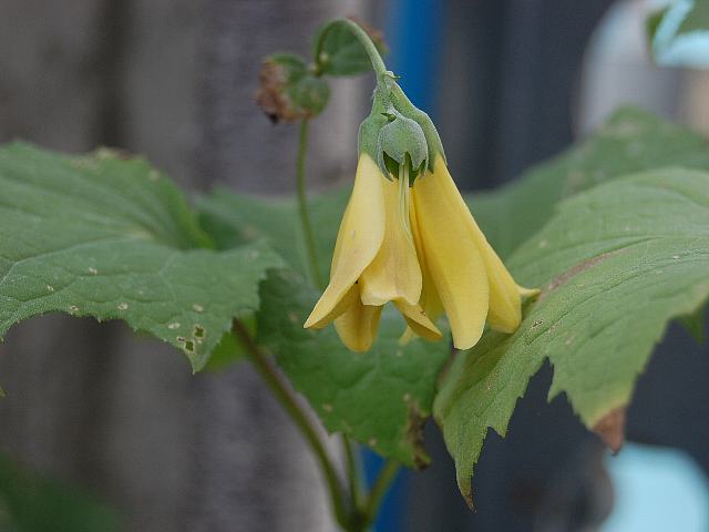 黄蓮華升麻(キレンゲショウマ) 夏の花 2012年08月15日 黄蓮華升麻(キレンゲショウマ)はユキノシタ科キレンゲショウマ属の多年草である。キレンゲショウマ属は1属1種である。分類体系によってはアジサイ科とされる。紀伊半島、四国山地、九州山地などの限られた地域に生える。自生地はブナ林帯の林床や湿った石灰岩地などである。海外では、朝鮮半島、中国にも分布する。環境省のレッドリスト(2007)では、「絶滅の危険が増大している種」である絶滅危惧II類(VU)に登録されている。草丈は80~120センチくらいである。葉は大型の円心形で手のひら状の切れ込みがあり、向かい合って生える(対生)。茎の下部につくはには柄があり、上部につく葉には柄がない。開花時期は7~8月である。葉の脇に疎らな円錐花序(下のほうになるほど枝分かれする回数が多く、全体をみると円錐形になる)を出し、筒状の黄色い花を斜め下向きに数輪つける。花弁は5枚である。肉厚で、平開はしない。雄しべは15本、雌しべの花柱は3本である。花の後にできる実はさく果(熟すると下部が裂け、種子が散布される果実)である。和名の由来はキンポウゲ科の蓮華升麻(レンゲショウマ)に似た花ということだが、実際にはあまり似ていない。属名の Kirengeshoma は日本語の「キレンゲショウマ」からきている。種小名の palmata は「手のひら状の」という意味である。写真は9月に富山県中央植物園で撮った。学名:Kirengeshoma palmata★そっと咲く黄蓮華升麻どことなく ひ弱なるゆえなお愛らしく花図鑑植物図鑑|味の麺匠戸田久|おこめの鬼平|フロム蔵王|花の本屋さん|楽天トラベル|