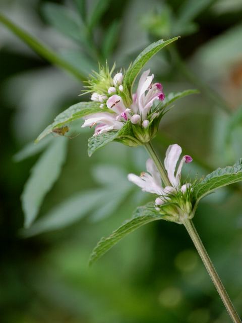 着せ綿(キセワタ) 夏の花 2012年08月17日 着せ綿(キセワタ)はシソ科メハジキ属の多年草である。北海道から九州にかけて分布し、山地の草原に生える。海外では、朝鮮半島、中国、中国東北部、ウスリー地方などにも分布する。和名の由来は、白い毛が花を覆っている様子を「花に着せた綿」に見立てたものである。環境省のレッドリスト(2007)では、「絶滅の危険が増大している種」である絶滅危惧II類(VU)に登録されている。葉は楕円形で、向かい合って生える(対生)。葉の先は尖り、縁にはぎざぎざ(鋸歯)がある。葉の質は紙質で、粗い毛が生える。近縁種の目弾き(メハジキ)の場合は葉が切れ込む。開花時期は7~9月くらいである。上部の葉の脇に段状に数個ずつ淡い紅紫色をした花をつける。花冠は筒状で、先は唇形に裂ける。上の唇の上部には白い毛が生える。下の唇は3つに裂ける。花の後にできる実は分果(複数の子房からできた果実)である。属名の Leonurus はギリシャ語の「leon(ライオン)+oura(尾)」からきている。長い花序の形から名づけられた。種小名の macranthus は「大きな花の」という意味である。写真は7月に東京都薬用植物園で撮った。学名:Leonurus macranthus★着せ綿の姿はどこか愛らしく 産毛なりやと花に見入って花図鑑植物図鑑|味の麺匠戸田久|おこめの鬼平|フロム蔵王|花の本屋さん|楽天トラベル|