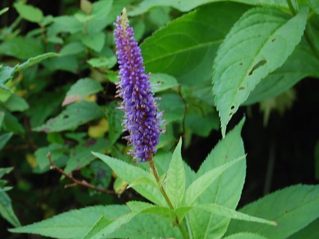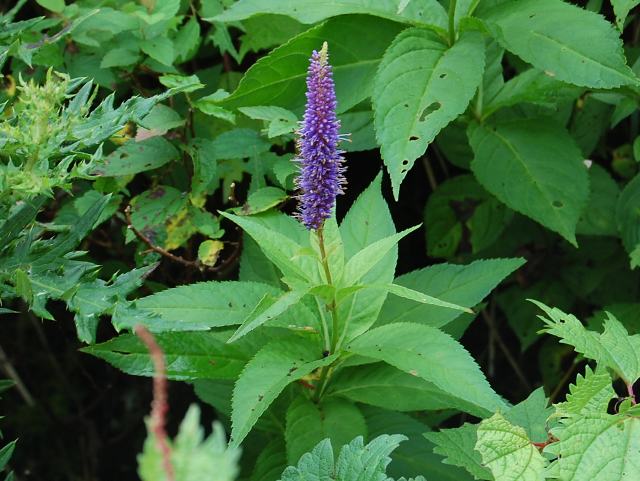伊吹九蓋草(イブキクガイソウ) 夏の花 2012年08月10日 伊吹九蓋草(イブキクガイソウ)はゴマノハグサ科クガイソウ属の多年草である。分類体系によってはオオバコ科とされる。分類上は、本州に広く分布する九蓋草(クガイソウ)の変種とされている。伊吹山の固有種で、基本種よりも背丈が低い。草丈は50センチくらいである。茎は直立する。葉は披針形で、4~8枚が輪生して何段もの層になる。葉は先が尖り、縁には細かいぎざぎざ(鋸歯)がある。開花時期は7~8月である。茎先に穂状の長い総状花序(柄のある花が花茎に均等につく)を出し、青紫色の小さな花をたくさんつける。花冠は筒状をしていて、先が浅く4つに裂ける。萼片は5枚で先が尖る。雄しべは2本、雌しべは1本である。花の後にできる実はさく果(熟すると下部が裂け、種子が散布される果実)である。属名の Veronicastrum はラテン語の「Veronica(クワガタソウ属)+astrum(似ている)」からきている。種小名の japonicum は「日本の」という意味である。変種名の humile は「背が低い」という意味である。写真は8月に伊吹山で撮った。学名:Veronicastrum japonicum var. humile ★背が低く同じ花とは思えない なるほど分ける見方もあるか花図鑑植物図鑑|味の麺匠戸田久|おこめの鬼平|フロム蔵王|花の本屋さん|楽天トラベル|