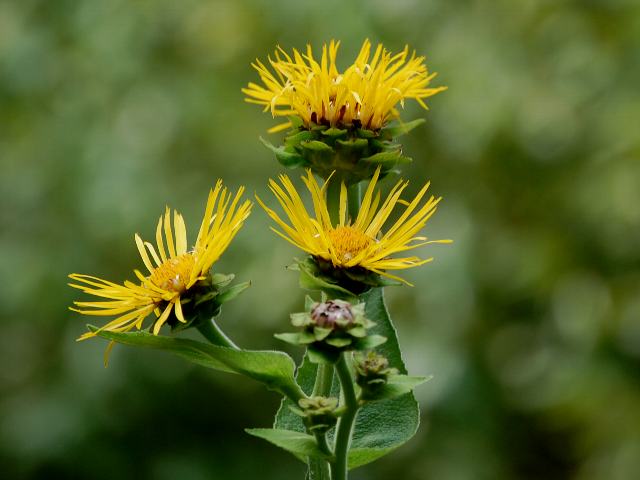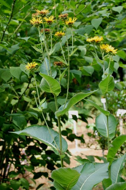 大車(オオグルマ) 夏の花 2012年08月11日 大車(オオグルマ)はキク科オグルマ属の多年草である。原産地はヨーロッパからコーカサス地方にかけてである。日本でも江戸時代から薬用として栽培されている。和名は小車(オグルマ)に似て大形であることからつけられた。草丈は1~3メートルである。茎にも葉にも軟毛が生える。葉は楕円形で、互い違いに生える(互生)。葉の先は尖り、縁にはぎざぎざ(鋸歯)がある。 開花時期は7~8月である。茎先に黄色い筒状花と舌状花からなる頭花をつける。 向日葵(ヒマワリ)によく似ている。花の後にできる実はそう果(熟しても裂開せず、種子は1つで全体が種子のように見えるもの)である。根を生薬で土木香(どもっこう)といい、発汗、利尿、去痰の薬効がある。英名はエリキャンペーン(elecampane)である。属名の Inula はオオグルマの古代ラテン名からきている。種小名の helenium はトロイの「ヘレン(Helena)」の名からきている。写真は7月に小石川植物園で撮った。学名:Inula helenium★夏の陽を一杯浴びて人様の 役に立てれば言うことはなし花図鑑植物図鑑|味の麺匠戸田久|おこめの鬼平|フロム蔵王|花の本屋さん|楽天トラベル|