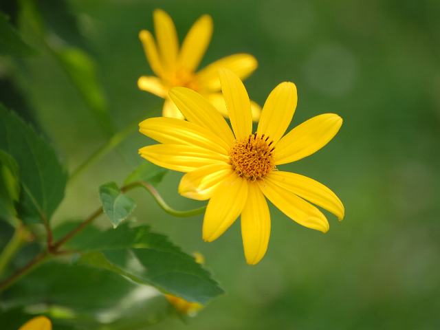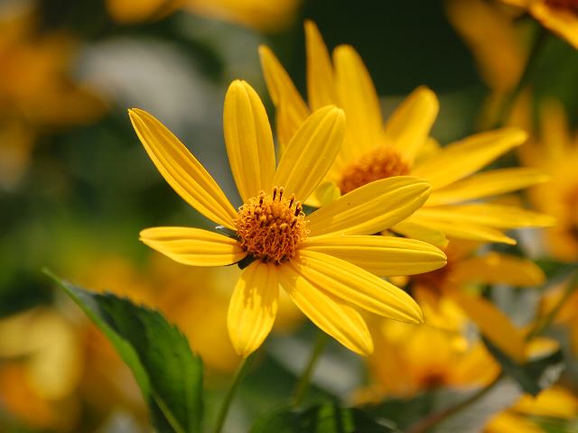 菊芋擬き(キクイモモドキ) 夏の花 2012年08月12日 菊芋擬き(キクイモモドキ)はキク科キクイモモドキ属(ヘリオプシス属)の多年草である。原産地は北アメリカである。日本へは明治時代の半ばに渡来した。ヒマワリ属の菊芋(キクイモ)によく似た花を咲かせることからこの名がついた。しかし、菊芋(キクイモ)と違って根塊はできない。別名を姫向日葵(ヒメヒマワリ)という。属名のヘリオプシス(Heliopsis)の名でも流通している。また、逸出したものが野生化している。草丈は50~150センチくらいである。葉は卵形で、向かい合って生える(対生)。茎や葉には短くて固い毛が生えている。開花時期は7~10月である。黄色または橙黄色の花(頭花)をいっぱい咲かせる。花径は5~6センチあり、八重咲きのものもある。舌状花は8~15枚である。花の後にできる実はそう果(熟しても裂開せず、種子は1つで全体が種子のように見えるもの)である。属名の Heliopsis はギリシャ語の「helios(太陽)+opsis(似た)」からきている。頭花の形からつけられた名である。種小名の helianthoides は「ヒマワリのような花の」という意味である。写真は7月に小石川植物園で撮った。学名:Heliopsis helianthoides★花びらをぐいと広げて咲き誇る 花の姿は向日葵に似て花図鑑植物図鑑|味の麺匠戸田久|おこめの鬼平|フロム蔵王|花の本屋さん|楽天トラベル|