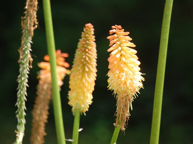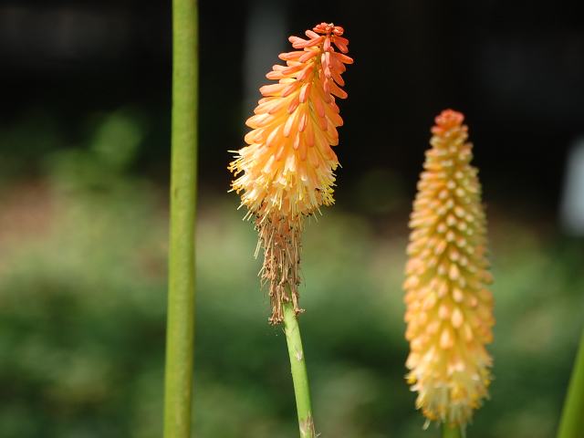 クニフォフィア・ファイアトーチ 夏の花 2012年07月26日 クニフォフィア(Kniphofia uvaria)はユリ科シャグマユリ属の常緑多年草である。分類体系によってはツルボラン科ないしススキノキ科とされる。旧属名のトリトマ(Tritoma)の名がポピュラーである。原産地は南アフリカの喜望峰地方である。日本へは明治時代の中期に渡来し、切り花や花壇用に栽培されている。和名は赤熊百合(シャグマユリ)、英名はトーチリリー(Torch lily)である。小型の姫トリトマ(ヒメトリトマ:Kniphofia triangularis)との交雑で多くの園芸品種が生まれている。ファイアトーチ(Fire Torch)はそうした園芸品種の1つである。開花時期は6~10月である。草丈は60から100センチくらいである。長い花茎の上部に、筒状の花を穂状につける。花は先が小さく6つに裂けていて下向きに密生し、下から咲きあがる。花の色は蕾のうちが淡いオレンジ色で咲き進むと黄色になる。属名の Kniphofia はドイツの植物学者「クニホフ(J. H. Kniphof)さん」の名からきている。品種名の Fire Torch は「たいまつ」のことである。写真は7月につくば植物園で撮った。学名:Kniphofia 'Fire Torch'★夏空をめざし元気に咲き昇る ファイアトーチの花勇ましく花図鑑植物図鑑|味の麺匠戸田久|おこめの鬼平|フロム蔵王|花の本屋さん|楽天トラベル|