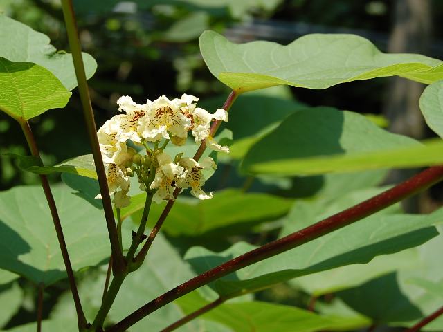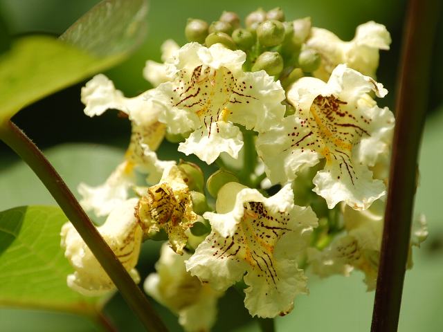 木大角豆(キササゲ) 夏の花 2012年07月27日 木大角豆(キササゲ)はノウゼンカズラ科キササゲ属の落葉高木である。原産地は中国の南部である。日本へは17世紀に薬用植物として渡来した。現在では野生化して河川敷などに生える。樹高は5~10メートルくらいである。葉は幅の広い卵形で、向かい合って生える(対生)。葉には長い柄があり、縁は浅く3つに裂ける。葉の裏面の葉脈上には毛が生える。開花時期は6~7月である。枝先に円錐花序(下のほうになるほど枝分かれする回数が多く、全体をみると円錐形になる)を出し、淡い黄色の釣鐘形の花をつける。花冠の内側には紫色の斑が入る。花冠の先は唇形に裂ける。実は細長いさく果(熟すると下部が裂け、種子が散布される果実)で、長さは30センチにも及ぶ。和名の由来は、細長い実の形をマメ科の大角豆(ササゲ)にたとえたものである。種子には利尿作用があり、民間薬とされる。属名の Catalpa はこの属のアメリカキササゲの北アメリカでの現地名からきている。種小名の ovata は「卵円形の」という意味である。写真は6月につくば植物園で撮った。学名:Catalpa ovata★美しい花の姿と面白い 鞘の形に個性を見せて季節の花花図鑑植物図鑑|味の麺匠戸田久|おこめの鬼平|フロム蔵王|花の本屋さん|楽天トラベル