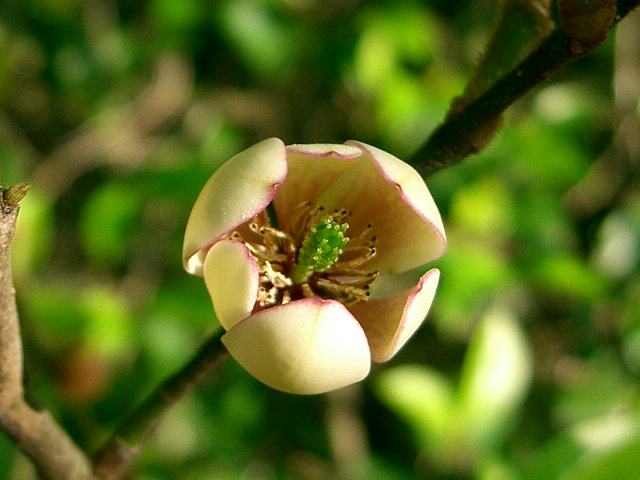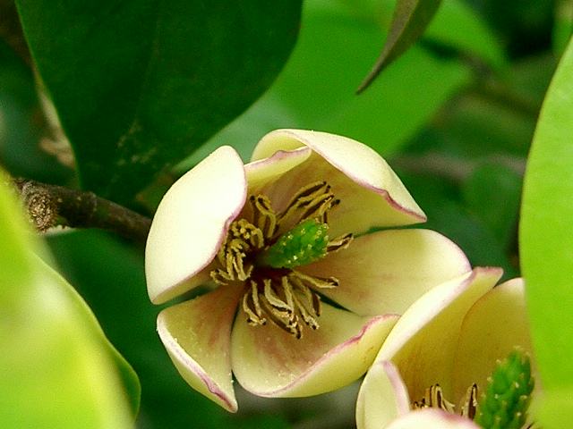 唐種招霊(カラタネオガタマ) 夏の花 2012年05月27日 唐種招霊(カラタネオガタマ)はモクレン科オガタマノキ属の常緑低木である。別名を唐招霊(トウオガタマ)とも言う。原産地は中国南部である。日本へは江戸時代の中期に渡来した。神社・仏閣などに植えられていることが多い。樹高は2~5メートルになる。葉の形は長い楕円形で、長さは4~8センチくらいである。先は尖っておらず、ぎざぎざ(鋸歯)もない。葉には艶と厚味があり、互い違いに生える。開花時期は5~6月である。葉の脇に花径3センチくらいの6弁花をつける。花弁と萼はアイボリーがかった色をしており、縁だけ紅色になる。中心部に雌しべがあり、回りを雄しべが取り巻いている。花の後にできる実は袋果(熟すと果皮が自然に裂けて種子を放出する)で、互いに離れるのが特徴である。花にはバナナのような香りがあって、香料としても用いられる。また、鎮咳、去痰などの効果もあるという。和名の由来は、日本に自生する招霊(オガタマ)の仲間で中国から来たことからきている。属名の Michelia はスイスの植物学者「ミケーリさん(M. Micheli)」にちなむ。種小名の figo は実の形が似ているイチジクのポルトガル語表記からきている。写真は5月に鎌倉の円覚寺松嶺院で撮った。学名:Michelia figo★庭に咲く唐招霊が手招きす 不思議の色と不思議の香り
