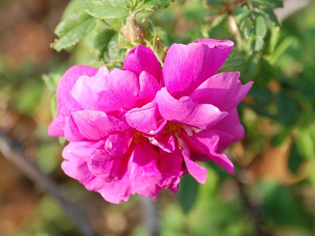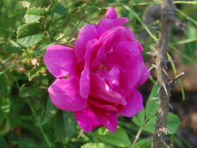 まい瑰(マイカイ) 春の花 2012年05月28日 まい瑰(マイカイ)はバラ科バラ属の落葉低木である。漢字もあるのだが、作字をしないと表示できないので平仮名交じりとする。マイは「攻」の字の偏を「王」にしたものを充てる。原産地は中国である。日本へは江戸時代に渡来した。日本にも分布する浜梨(ハマナス)の近縁種である。かつては両者が同一であると考えられていた時代もある。現在では、本種は浜梨(ハマナス)の変種であると考えられている。また、牧野富太郎博士は両者がまったくの別物であると考え、異なる種小名をつけた。樹高は1メートルくらいである。葉は楕円形で、互い違いに生える(互生)。開花時期は5月である。花は中輪で半八重咲きである。花の色は濃い紅紫色で、よい香りがする。花や蕾を干したものはローズ油の原料とされる。また、蕾を干したものは中国茶に利用される。花の後にできる実は偽果(子房以外の部分が加わってできている果実)である。属名の Rosa はケルト語の「rhodd(赤色)」からきている。種小名の odorata は「よい香りのする」という意味である。変種名の ihea は江戸時代の園芸家「伊藤伊兵衛さんの」という意味である。写真は5月に東京都薬用植物園で撮った。薬用植物園での学名表示は牧野説をとっている。学名:Rosa odorata var. ihea(=Rosa rugosa var. plena)★薄っすらとその名は知っていたけれど 実物を見てほっと溜め息花図鑑植物図鑑|味の麺匠戸田久|おこめの鬼平|フロム蔵王|花の本屋さん|楽天トラベル|PR