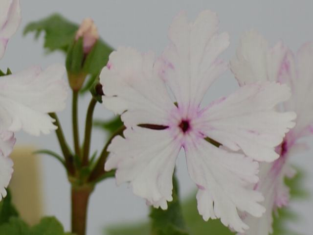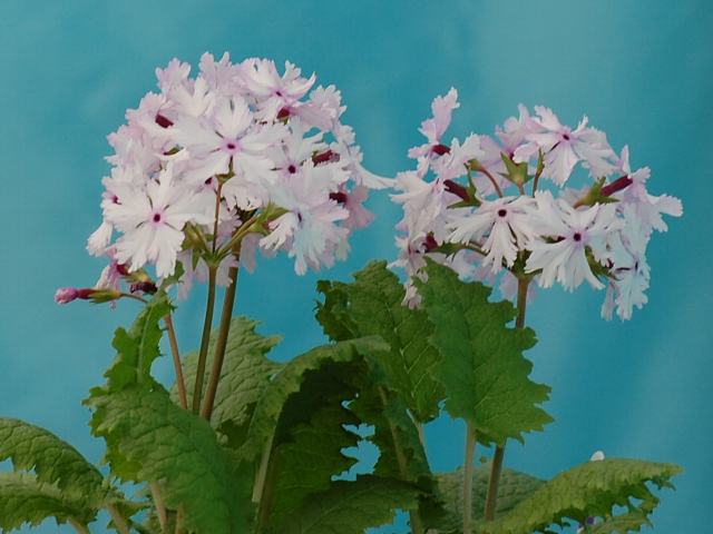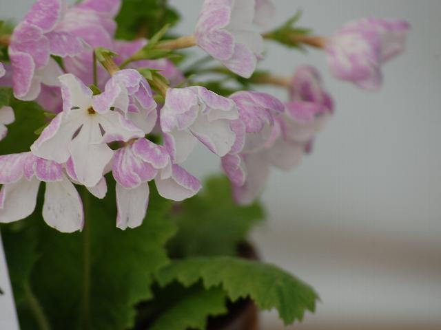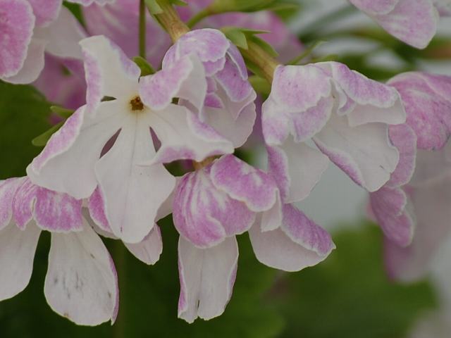 鹿島(カシマ) 春の花 2012年05月05日 桜草(サクラソウ)はサクラソウ科サクラソウ属の多年草である。北海道から九州にかけて分布し、河原や山間の低湿地、草原などに生える。海外では、朝鮮半島や中国の東北部、東シベリアなどにも分布する。また、300ほどの園芸品種があり、その半数は江戸時代に改良されたものである。鹿島(カシマ)もそうした園芸品種の1つである。本種は1907年(明治40年)に発表された。名は当時の軍艦の名に因んでつけられた。草丈は15センチから30センチくらいである。根際から生える葉は楕円形で皺が多く、縁には重鋸歯(大きなぎざぎざに更に細かなぎざぎざがある)がある。葉の裏には毛が生えている。開花時期は4月から5月である。茎先に散形花序(枝先に1個つずつ花がつく)を出し、中輪花(花径3~4センチ)をたくさんつける。花冠の裏側は淡い紅紫色である。花冠の表側は白く、底紅紫色のぼかしが入る。花形はかがり広弁、花のつき方は平咲き、横向き咲き、花柱の形は僅長柱花である。属名の Primula はラテン語の「primos(最初)」縮小形である。プリムラ・ベリスが早春に他に花に先駆けて咲くことから名づけられた。種小名の sieboldii は日本植物の研究者「シーボルトの」という意味である。写真は4月に太田市大光院の関東山野草展で撮った。学名:Primula sieboldii 'Kashima'★伝いくる時代の熱気感じ見る 鹿島の花は愛くるしくて花図鑑植物図鑑|味の麺匠戸田久|おこめの鬼平|フロム蔵王|花の本屋さん|楽天トラベル|