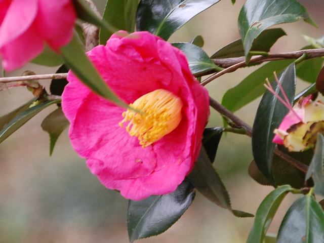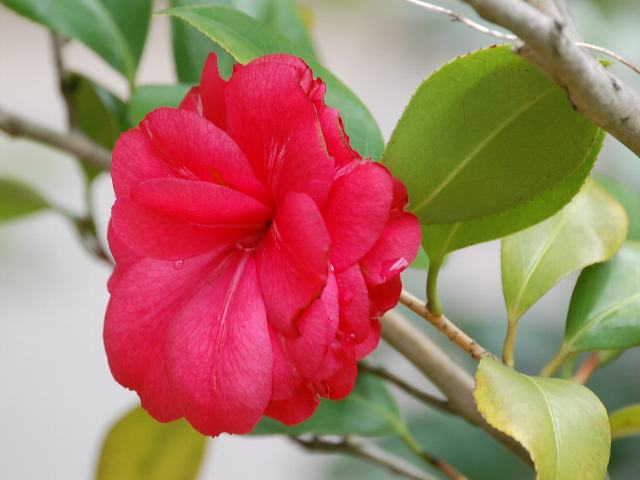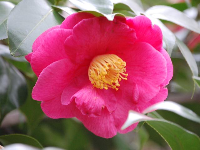 紅葉狩(モミジガリ) 春の花 2012年04月27日 藪椿(ヤブツバキ)はツバキ科ツバキ属の常緑低木~高木である。本州の青森県から沖縄にかけて分布する。一般的に椿(ツバキ)と呼ばれ、園芸品種の基本種となっている。紅葉狩(モミジガリ)もその園芸品種の1つである。江戸古典種である。樹高は1~3メートルである。葉は長い楕円形で、向かい合って生える(対生)。開花時期は3~4月である。花は八重・千重咲きの中輪(花径7~9センチ)で、濃い紅色をしており、花弁の真ん中に白い筋が入る。雄しべは筒しべとなる。属名の Camellia はイエズス会の宣教師「カメル(G. J. Kamell)さん」の名からきている。マニラに住み、東アジアの植物を採集した。種小名の japonica は「日本の」という意味である。写真は4月に神奈川県立フラワーセンター大船植物園で撮った。学名:Camellia japonica 'Momijigari'★赤々と燃えて花咲く紅葉狩 きれいな筋は次の楽しみ植物図鑑花図鑑|味の麺匠戸田久|おこめの鬼平|フロム蔵王|花の本屋さん|楽天トラベル|