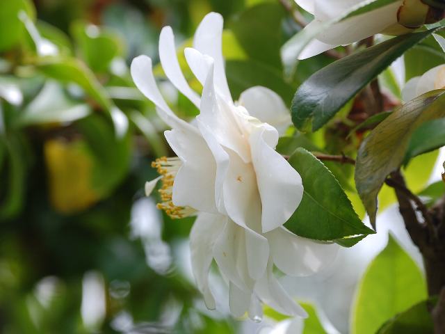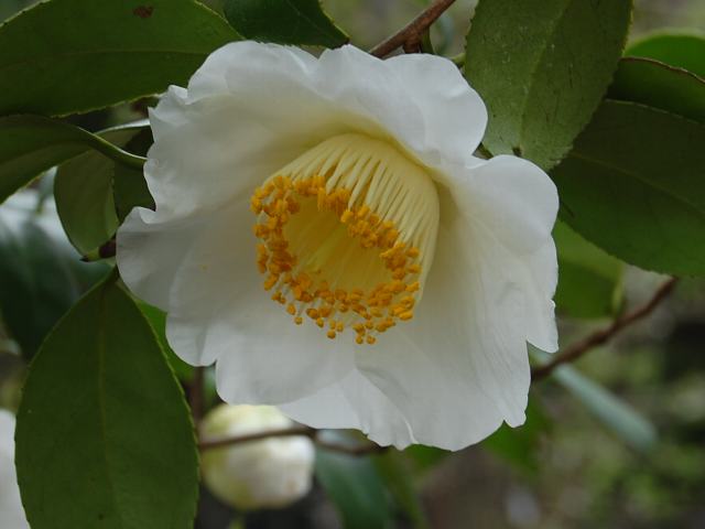 雪見車(ユキミグルマ) 春の花 2012年04月23日 藪椿(ヤブツバキ)はツバキ科ツバキ属の常緑低木~高木である。本州の青森県から沖縄にかけて分布する。一般的に椿(ツバキ)と呼ばれ、園芸品種の基本種となっている。雪見車(ユキミグルマ)もその園芸品種の1つである。江戸古典種である。樹高は1~3メートルである。葉は長い楕円形で、向かい合って生える(対生)。開花時期は3~4月である。白い一重・平開咲きの中輪(花径7~9センチ)をつける。雄しべは輪芯(わじん)となる。属名の Camellia はイエズス会の宣教師「カメル(G. J. Kamell)さん」の名からきている。マニラに住み、東アジアの植物を採集した。種小名の japonica は「日本の」という意味である。写真は4月につくば植物園で撮った。学名:Camellia japonica 'Yukimi Guruma'★形よく咲いたその名は雪見車 とても目立つね大きな雄しべ花図鑑植物図鑑|味の麺匠戸田久|おこめの鬼平|フロム蔵王|花の本屋さん|楽天トラベル|