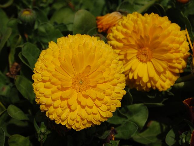 金盞花(キンセンカ) 春の花 2012年04月13日 金盞花(キンセンカ)はキク科キンセンカ(カレンジュラ)属の一年草もしくは越年草である。秋播きで春に開花するが、8月播きの早生系は年内に楽しむことができる。原産地はヨーロッパ南部で、特にカナリア諸島には約20種が分布する。日本へは江戸時代の末に中国から渡来した。草丈は30~60センチくらいである。茎は直立をし、よく枝分かれをする。葉はへら状で、互い違いに生える(互生)。開花時期は10月~5月と長い。一般に見かけるのは3月ごろからのものが多い。花の色は黄色、オレンジ色、クリーム色などである。花径は7~12センチくらいである。一重咲きのものと八重咲きのものがある。日の出とともに開き夜には花を閉じる。花の後にできる実はそう果(熟しても裂開せず、種子は1つで全体が種子のように見えるもの)である。和名は中国名の「金盞花」を日本語読みしたもので、「盞」には盃の意味がある。花の色と形を「金の盃」にたとえたものである。英名はポットマリーゴールド(pot marigold)である。ヨーロッパでは、古くから食用や薬用(虫さされの薬)として使われてきた。俳句の季語は春である。属名の Calendula はラテン語の「Calendae(毎月の第1日)」からきている。どの月の初めにも咲いているほど花期が長いということから名づけられた。種小名の officinalis は「薬用の」という意味である。写真は4月に神奈川県立フラワーセンター大船植物園で撮った。学名:Calendula officinalis★真っ直ぐに空を見上げて金盞花 燃える思いを忘ることなく☆金盞花君への想い果てしなく ただひたすらに共にあれかし花図鑑植物図鑑|味の麺匠戸田久|おこめの鬼平|フロム蔵王|花の本屋さん|楽天トラベル|