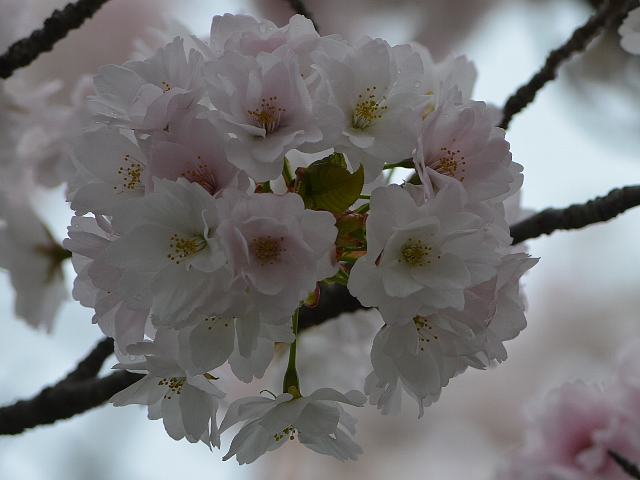 揖斐の二度桜(イビノニドザクラ) 春の花 2016年03月25日 揖斐の二度桜(イビノニドザクラ)はバラ科サクラ属の落葉小高木である。原木は岐阜県揖斐郡大野町の田んぼの中の古墳の上にある。江戸時代から知られる名木で、国の天然記念物に指定されている。山桜(ヤマザクラ)の園芸品種である。「二度桜」の名は、一重と八重の花を二度つけるということからきている。樹高は4メートルから8メートルくらいである。葉は幅の広い楕円形で、互い違いに生える(互生)。葉の先は尖り、縁にはぎざぎざ(鋸歯)がある。葉の表面には開出毛(立ち上がるようにつく毛)がある。開花時期は4月の上旬から中旬である。咲き始めは一重咲きで花弁は5枚だが、咲き進むと花弁数が増え、八重咲きや二段咲きへと変化する。花弁数は5枚から15枚、花径は3センチくらいの中輪である。花の色は白ないし淡い紅色である。花弁の形は楕円形である。属名の Prunus はラテン語の「plum(スモモ)」からきている。種小名の jamasakura は「ヤマザクラ」のことである。園芸品種名の Heteroflora は「いろいろの花の」という意味である。写真は4月に三島市の国立遺伝学研究所で撮った。学名:Prunus jamasakura 'Heteroflora'★めずらしい桜の花に興奮し 震える思いでシャッターを切る桜図鑑花図鑑植物図鑑ミラーサイト|味の麺匠戸田久|おこめの鬼平|フロム蔵王|花の本屋さん|楽天トラベル|